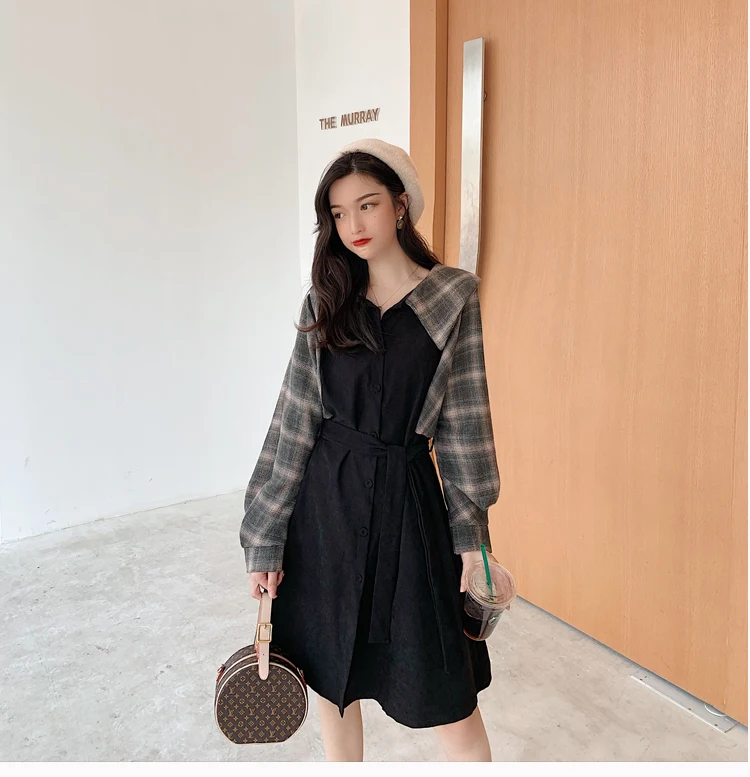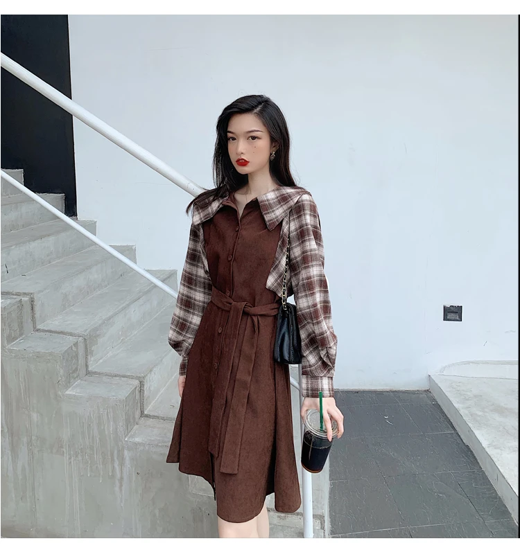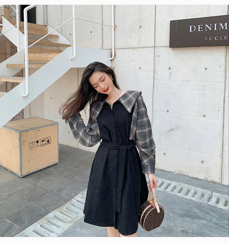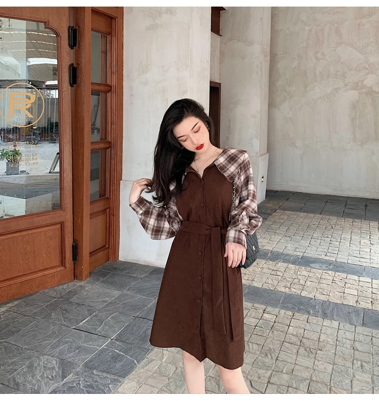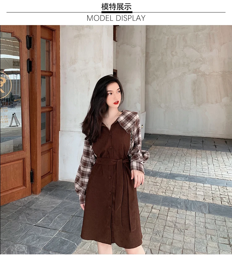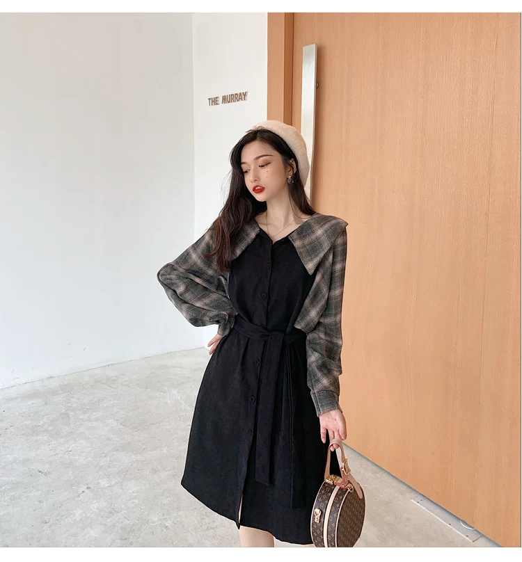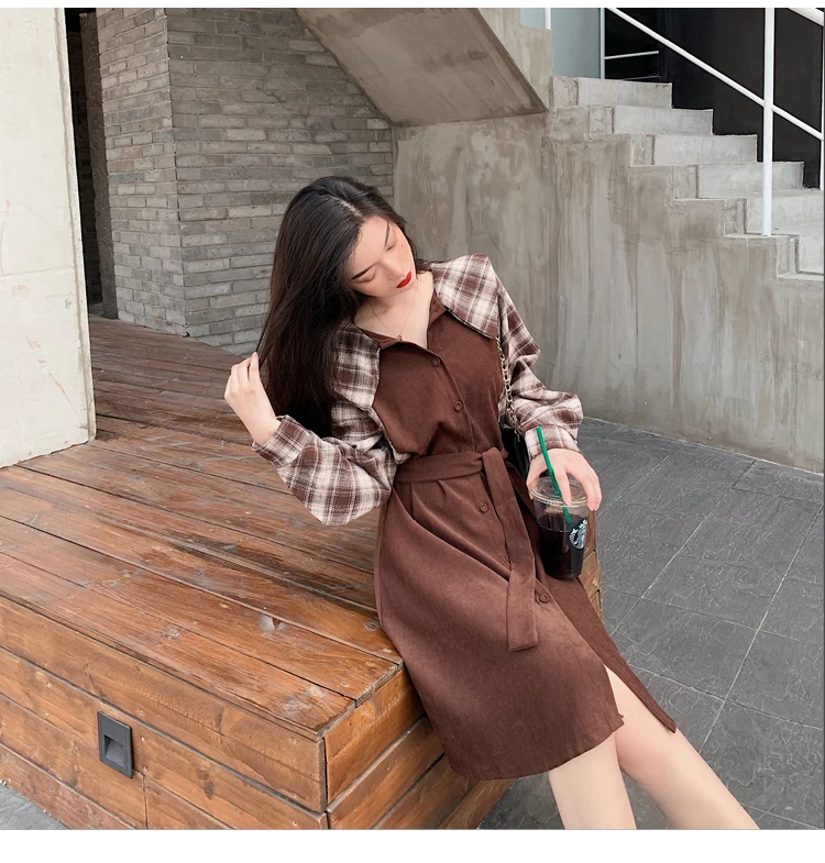 Клетчатые платья, лидер продаж, женское модное платье-рубашка с длинными рукавами в стиле пэчворк, клетчатое винтажное платье на пуговицах, милое 1138