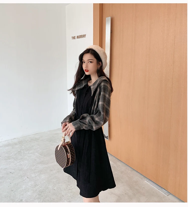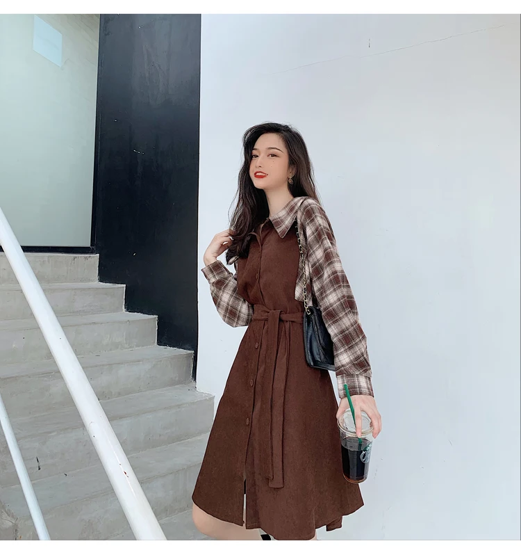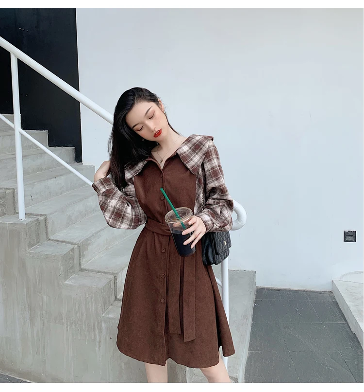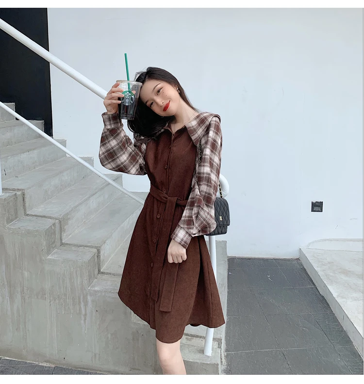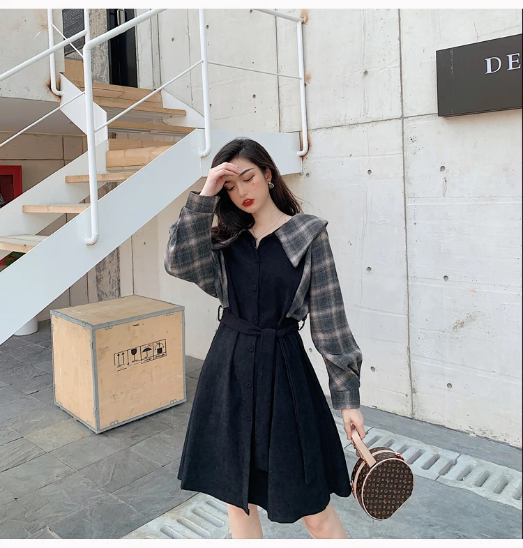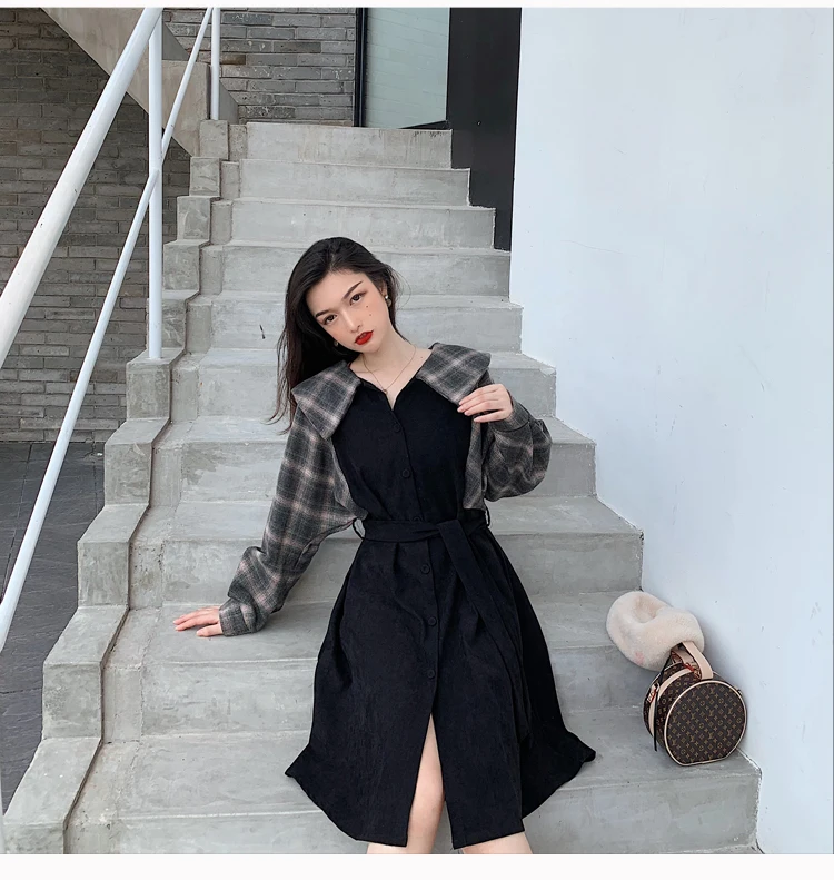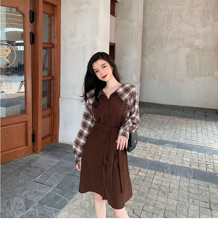 Клетчатые платья, лидер продаж, женское модное платье-рубашка с длинными рукавами в стиле пэчворк, клетчатое винтажное платье на пуговицах, милое 1138