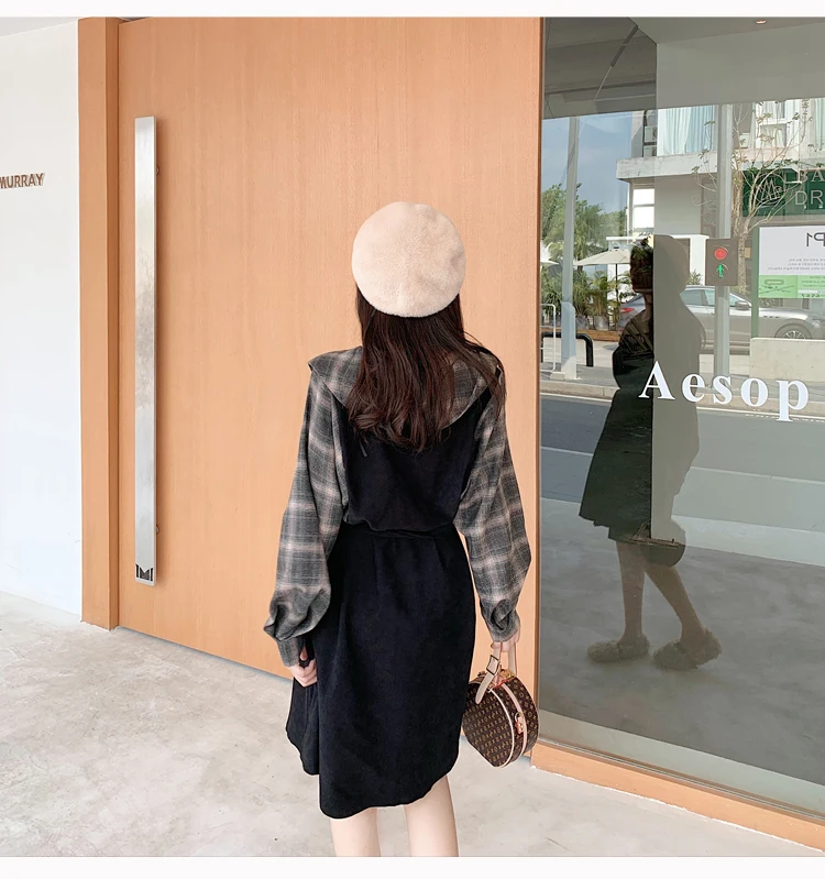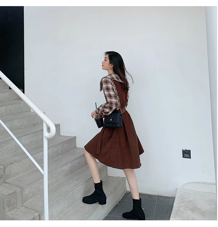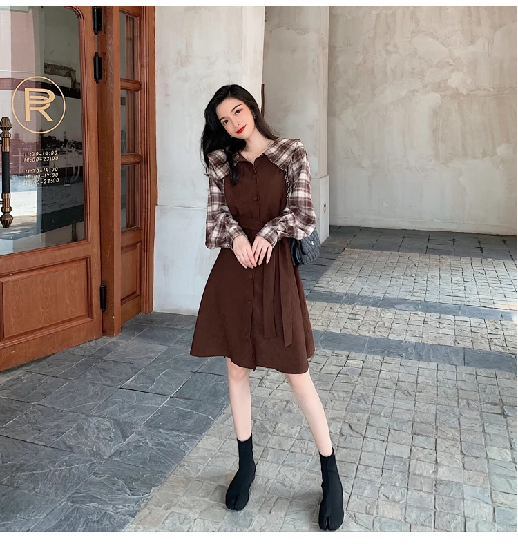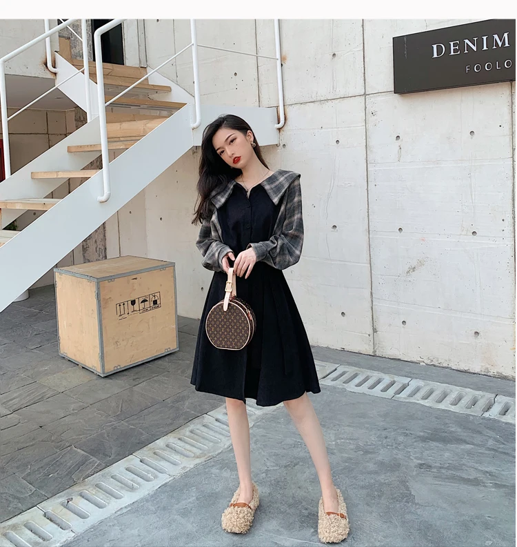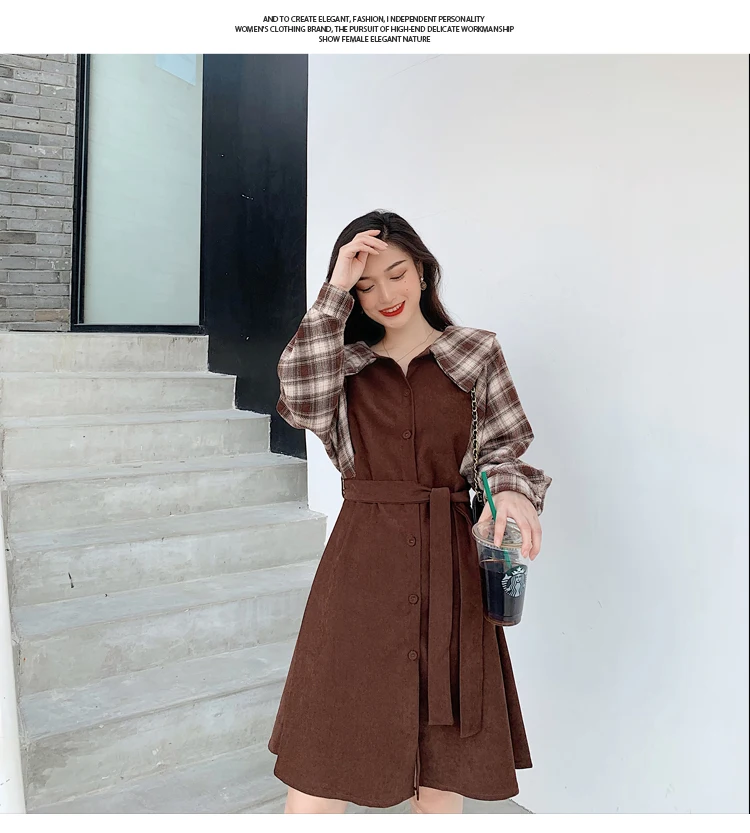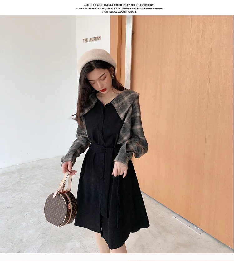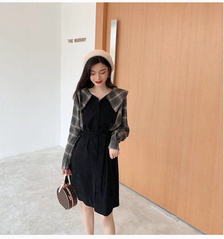 Клетчатые платья, лидер продаж, женское модное платье-рубашка с длинными рукавами в стиле пэчворк, клетчатое винтажное платье на пуговицах, милое 1138