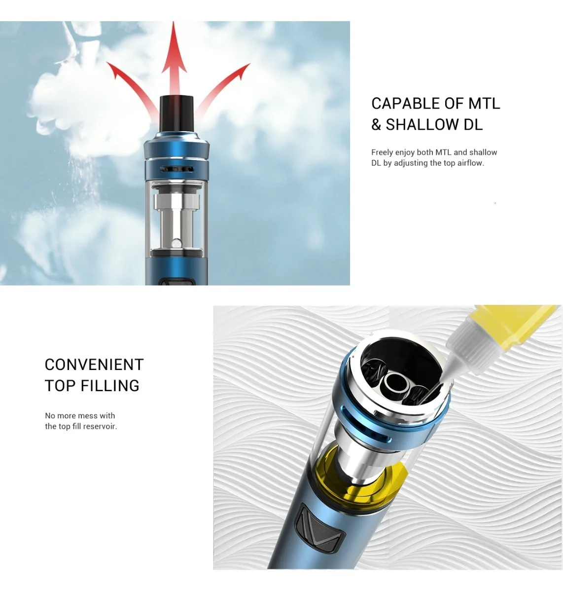 Дизайн «все в одном», простота использования Верхний поток воздуха, благоприятный и герметичный Способен на MTL и мелкий DL Компактный и портативный Удобное заполнение сверху