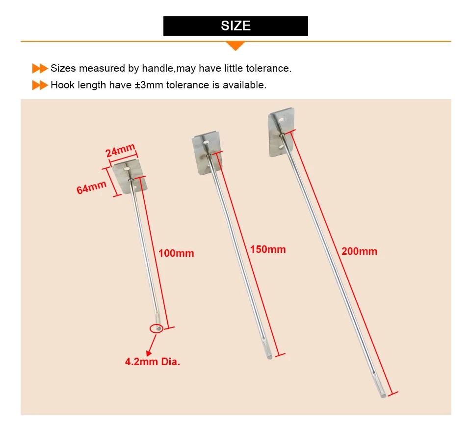 5 шт. 100/150/200 мм супермаркет настенный бортовые крюки вешалка металлический хромированный настенный кронштейн для телевизора Дисплей крюк Название: настенный крючок Длина: 100/150/200 мм Стержень Диаметр: 4,2 мм Материал: металл, хромированный Посылка: 5 крючков