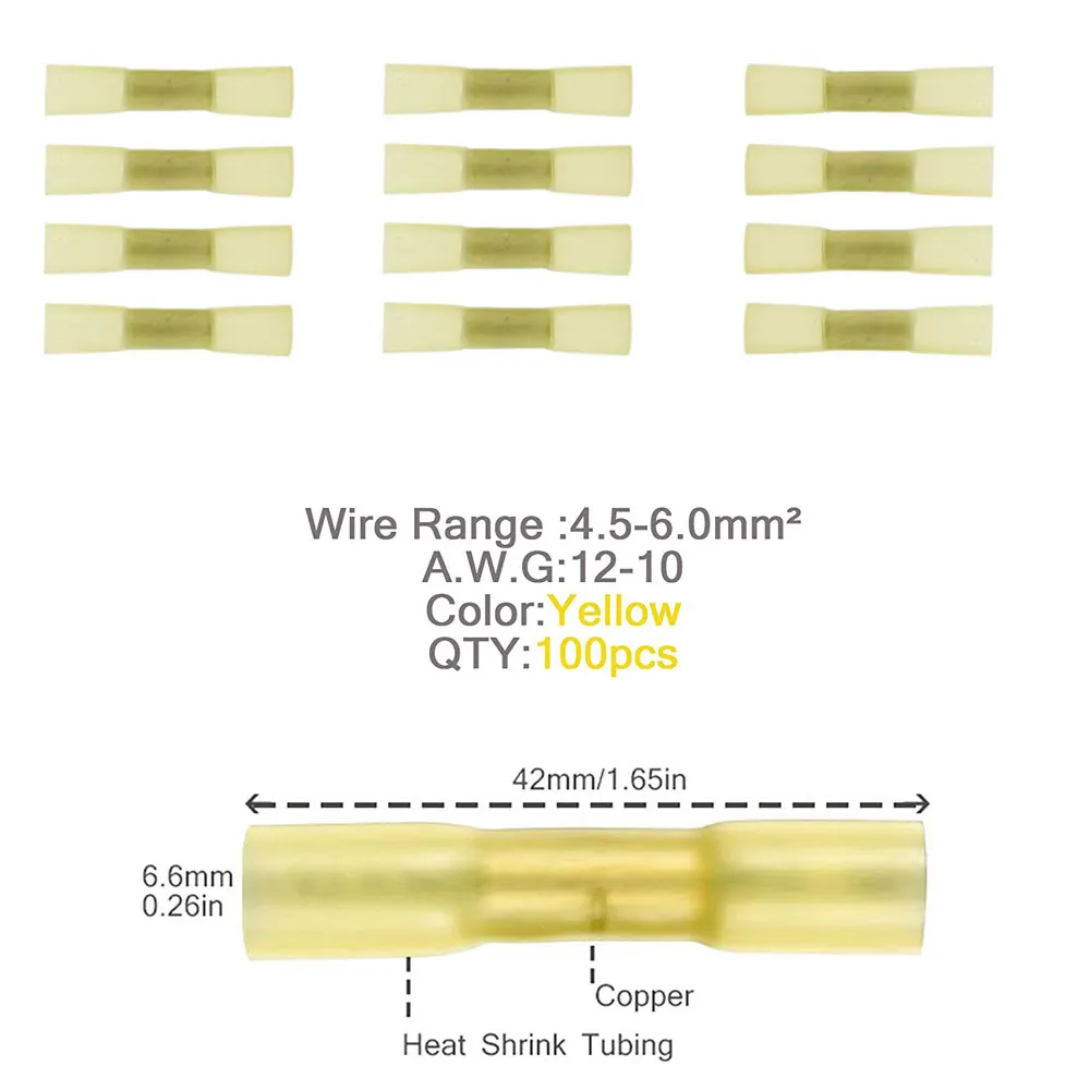 Он может усадиться за считанные секунды и быстро остыть. Безопасный огнестойкий материал, тонкая работа, безопасный нетоксичный, горячий мягкий эластичный, хорошая теплоизоляция Нагрейте его горячим воздушным пистолетом и выдавливайте посередине. Желтый СОЕДИНИТЕЛЬ: подходит для кабеля/провода размером 4,0-6.0mm2 12-10 A.W.G Посылка включает в себя: 1 упаковка из 100 термоусадочных встык обжимной разъем для проводов.