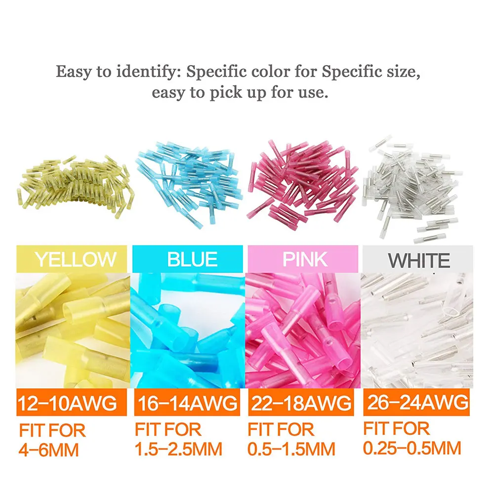 100% новый товар высокого качества. Стандартный обжим, а затем уплотнение Термоусадочных стыковых соединителей. Конструкция с двумя стенками, отличное растяжение и механическое сопротивление повреждениям, высокая эластичность обеспечивает стабильную работу. Идеальный полупрозрачный обеспечивает прочность на растяжение, позволяет визуально проверять, предотвращает коррозию и обеспечивает водонепроницаемое уплотнение. Для достижения наилучших результатов используйте пистолет горячего воздуха до тех пор, пока он не уменьшит размер и поток клея, заполняя зазоры в терминале.