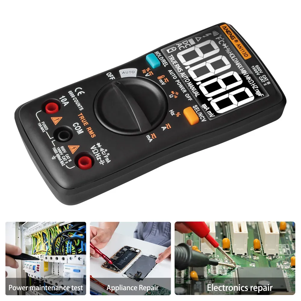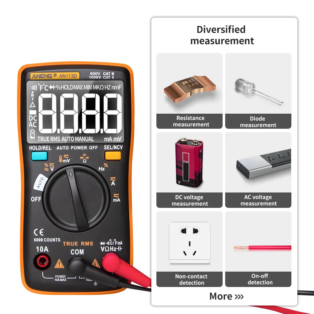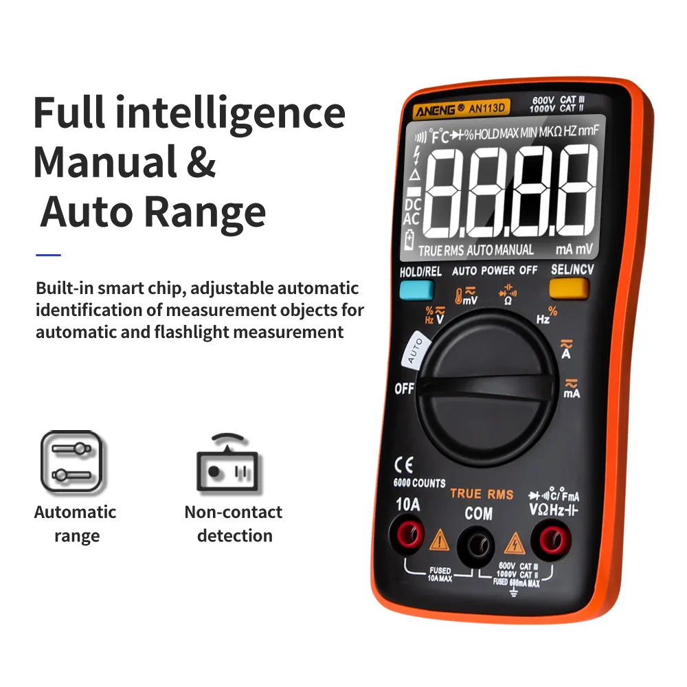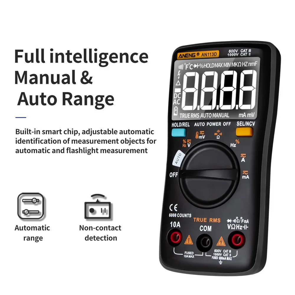 Этот продукт представляет собой многофункциональный, автоматический цифровой мультиметр с 6000 счетами и ЖК-дисплеем. Функции измерения включают напряжение постоянного/переменного тока, ток переменного/постоянного тока, сопротивление, диодный тест/непрерывность, NCV, частоту/рабочий цикл, емкость, температуру. Поддерживает true RMS, автоматическое отключение и хранение данных.