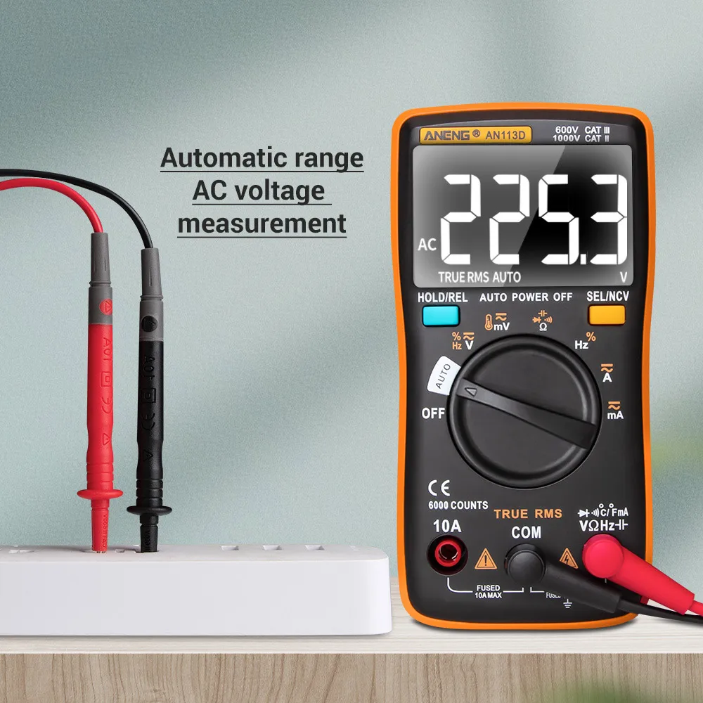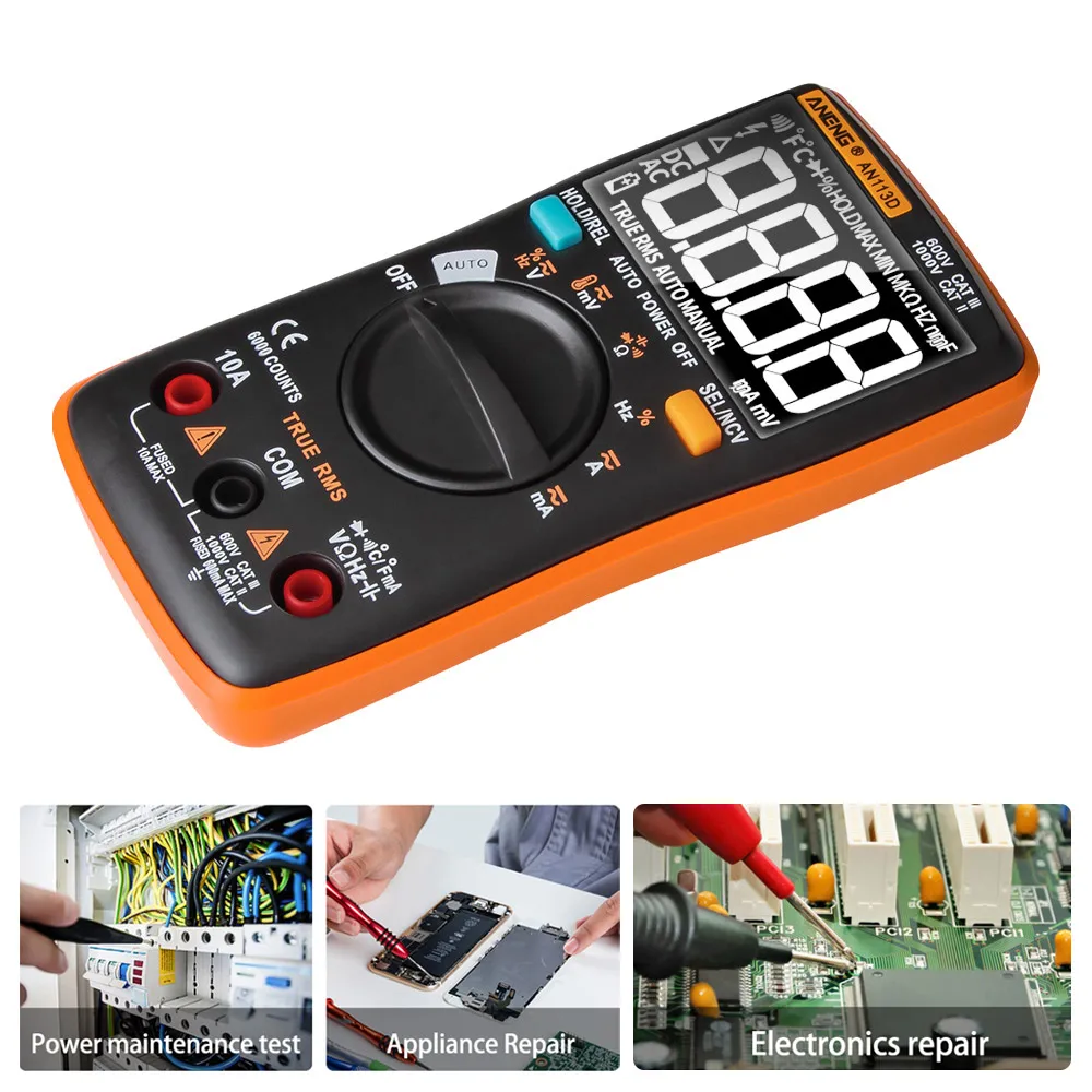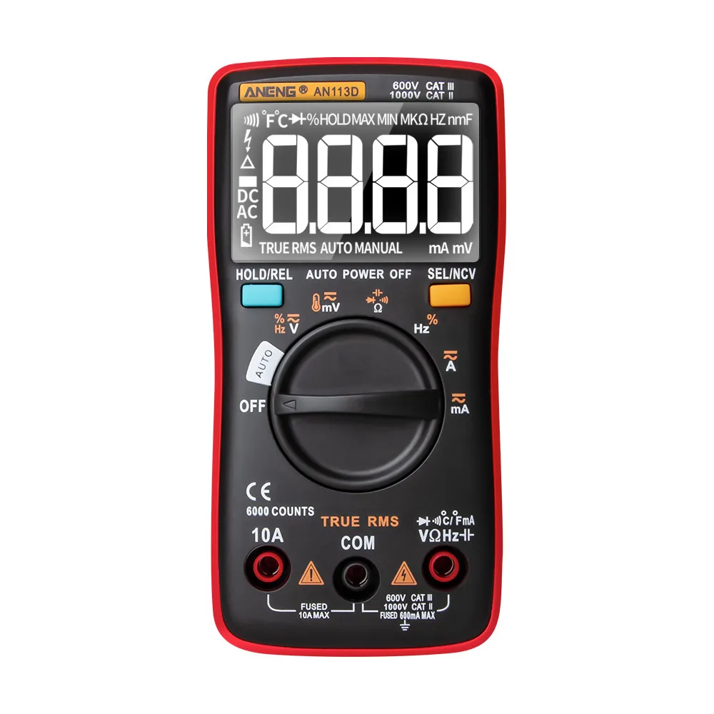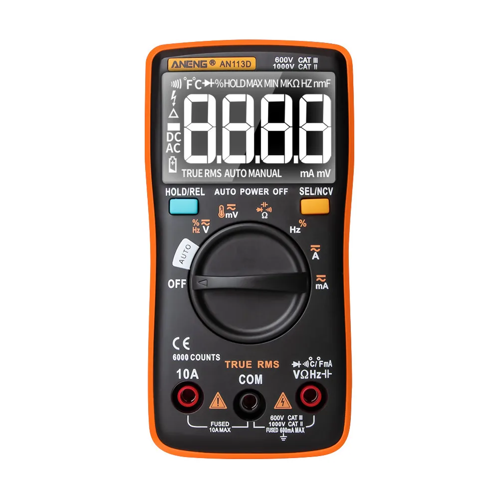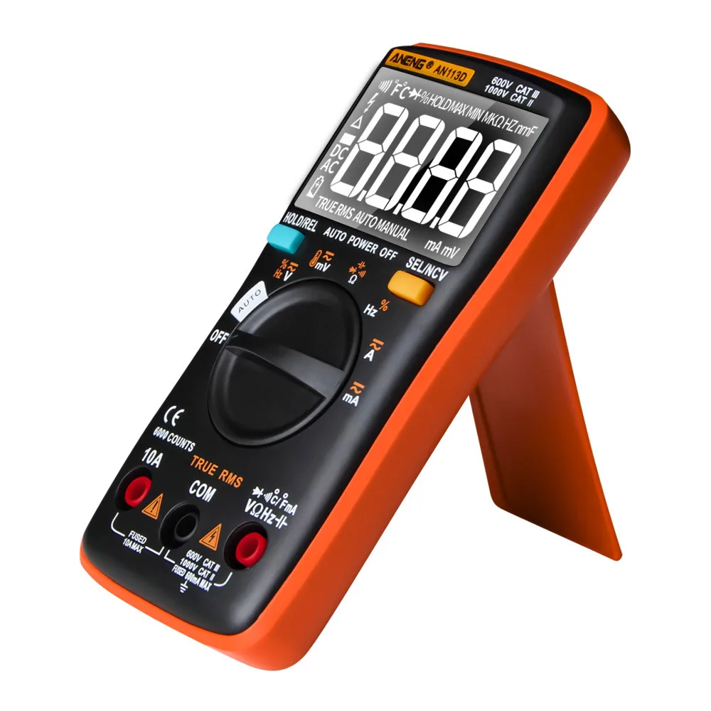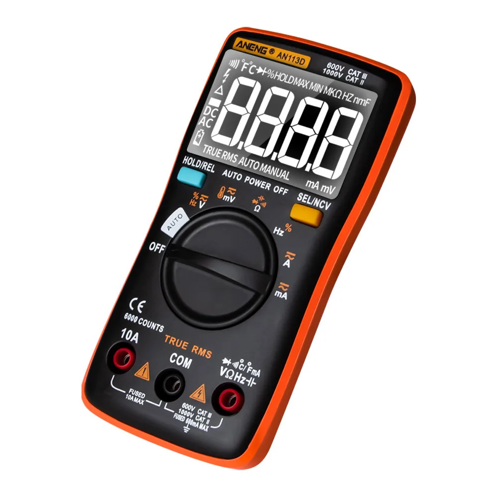 Многофункциональный мультиметр с ЖК-дисплеем с подсветкой, может использоваться для измерения напряжения постоянного/переменного тока, переменного/постоянного тока, сопротивления, диодного теста/непрерывности, NCV, частоты/рабочего цикла, емкости, температуры.