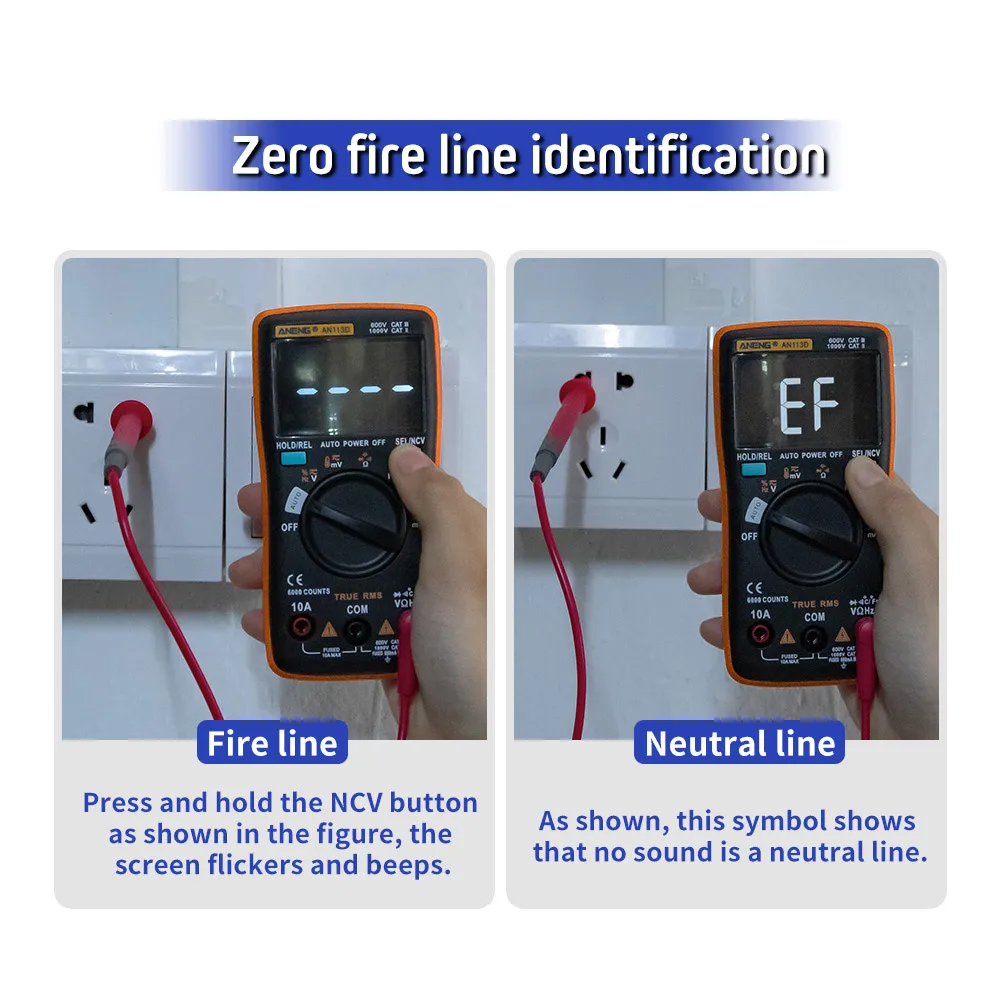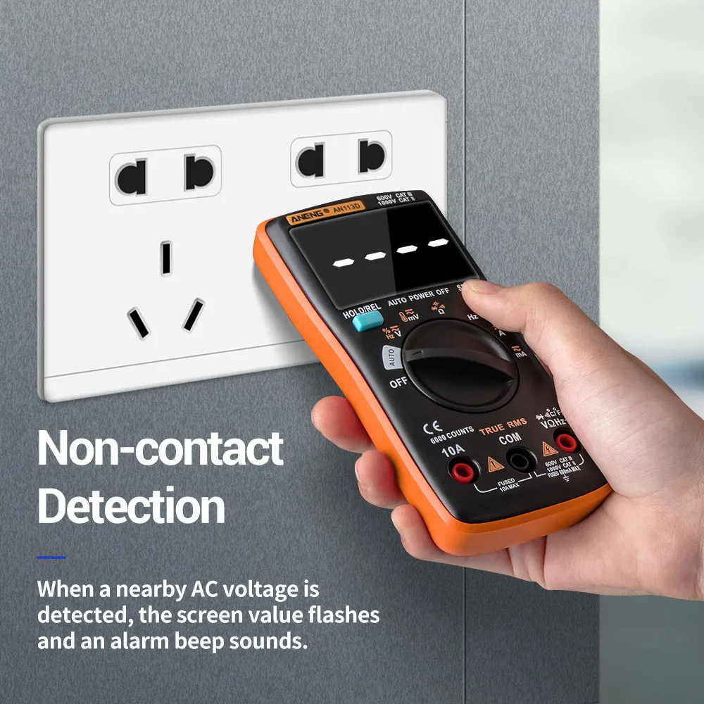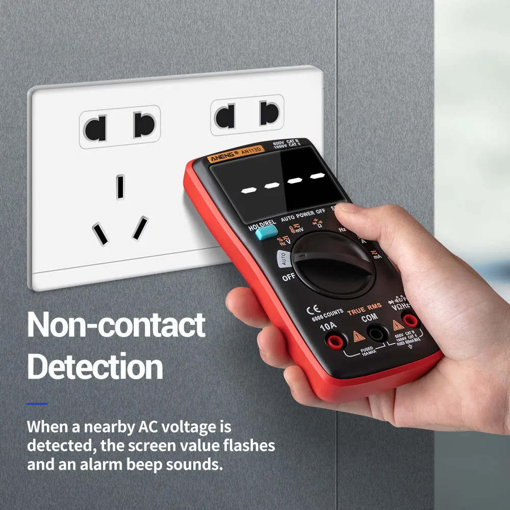 Встроенный датчик, поддерживает Бесконтактное обнаружение, при обнаружении рядом напряжения переменного тока, значение экрана мигает и звуковой сигнал тревоги.
