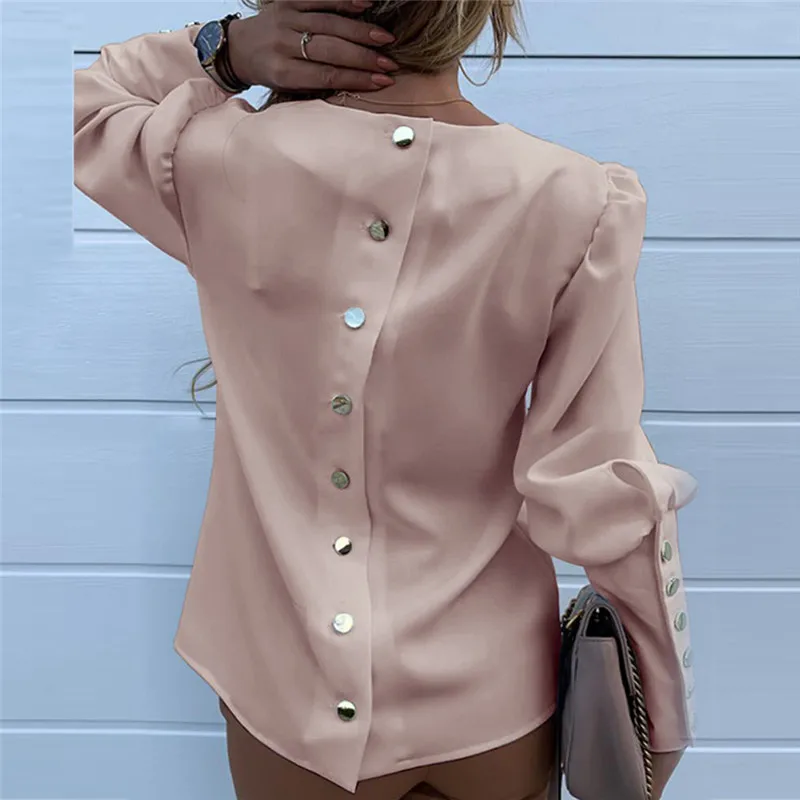 Женские свободные повседневные блузки, новые модные топы с круглым вырезом и длинными рукавами-фонариками, Женская Осенняя рубашка с пуговицами сзади, пуловеры, Женский Топ!