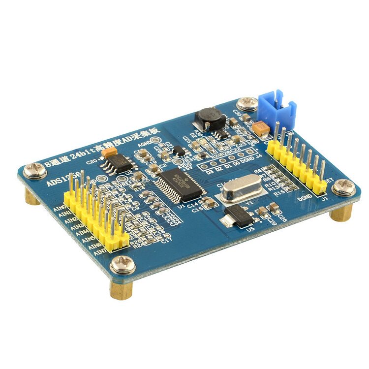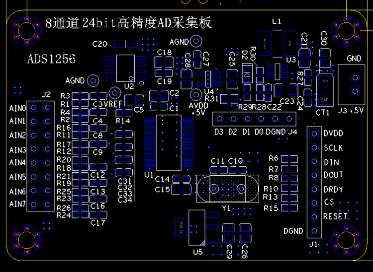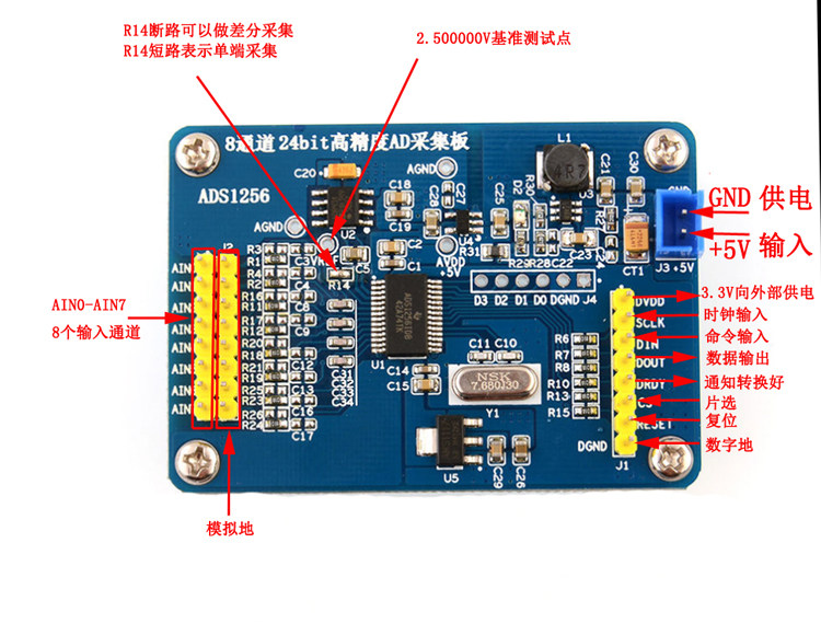 1. Power input terminal, the upper end is ground and the lower end is +5V. 2.LT3461 power chip, high ripple noise rejection ratio. 3. Power indicator. 4.LP2985, LDO can effectively filter out low frequency noise, produce a very pure +5V, provide analog power for ASD1256. 5. ADR431BRZ, B series is a high precision reference. The reference chip produces a high precision 2.500000V reference 6. Benchmark test holes. 7. Analog input, AIN0-AIN7 has a total of eight input ports, which can be used as 8 independent single-ended inputs, or as a group of 4 differential inputs. AIN0 and AIN1 are a group, AIN2 and AIN3 AIN4 and AIN5 AIN6 and AIN7 . 8. Analog ground input 9. Input resistance and attenuation resistance. The attenuation resistor is not soldered by default. 10.ADS1256 main control chip 11. AMS1117-3.3v, providing digital voltage to the ADS1256. 12.NSK brand crystal oscillator, 7.68MHZ 13. Communication interface with MCU.