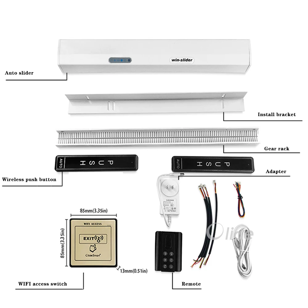 Один полный комплект включает элементы на изображении выше, есть один автоматический слайдер, один кусок Wifi переключатель доступа, один набор беспроводных кнопочных переключателей, мотор, пульт дистанционного управления, 0.5mx 2 шт стойки, монтажные аксессуары.