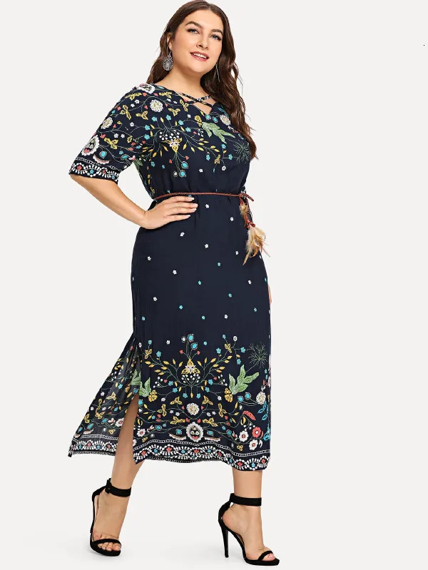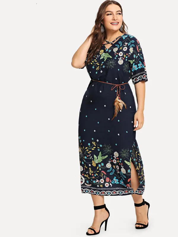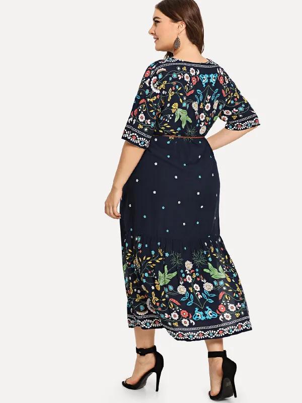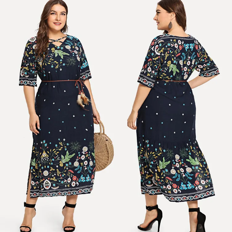 Летнее женское платье с коротким рукавом и цветочным принтом в богемном стиле, Повседневное платье с v-образным вырезом, винтажное женское платье макси для отдыха размера плюс