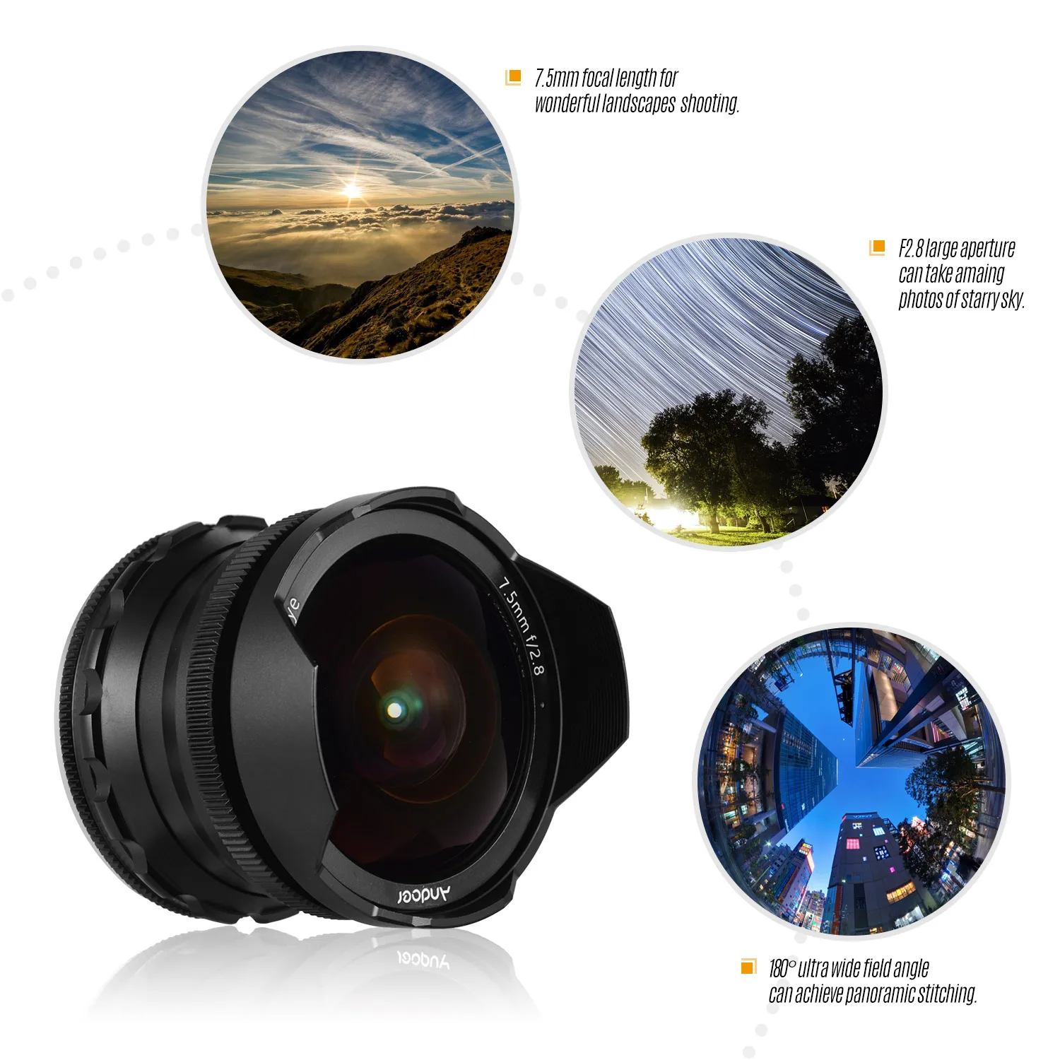 7,5 мм фокусное расстояние и 180 ° ультра широкий угол поля, подходит для пейзажей, VR панорамы, путешествий, подводной фотографии и т. Д.