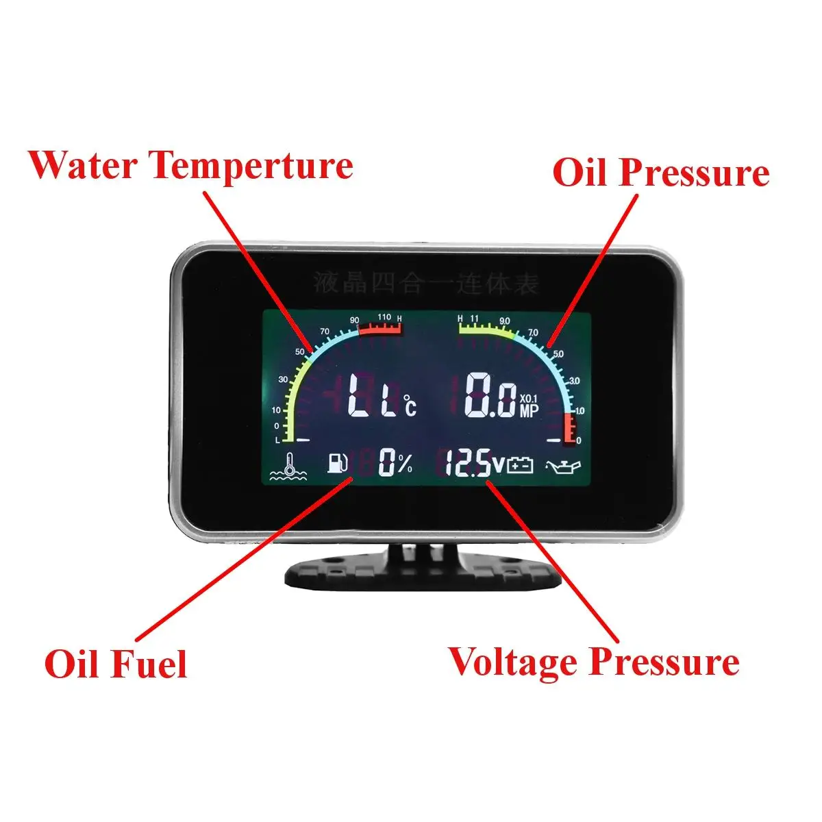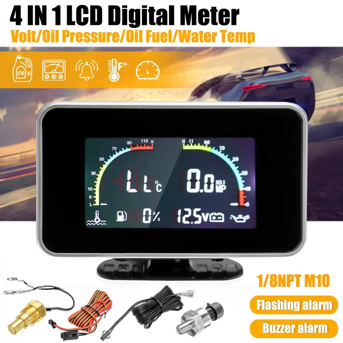 4в1 ЖК-дисплей автомобиля цифровой Датчик Вольтметр/давление масла/топлива/температура воды 12-24 В Описание продукта:Название: Автомобильный ЖК-дисплей 4 в 1 Манометр (температура воды/давление масла/топливо/датчики напряжения)Материал: Пластик оболочкиРазмер изделия: 9,5x6,3x3,2 смИсточник питания: 9-36 В постоянного токаРабочая температура:-40-50 °Рабочая влажность: 45%-75% относительной влажностиВинт Датчика Температуры: M10Датчик давления масла: 1/8 NPT Тесты параметры:Тест напряжения: 9-36 в, Точность: ± 1%, сигнал тревоги: <10 В/16-20 в/> 31 ВИспытание температуры воды:-10-120 °, Точность: ± 1%, сигнал тревоги:> 95 °Испытание топлива: 0-1.0MP, Точность: ±0. 1%, сигнал тревоги: 0.1MPИспытание давления масла: 5-1000 Ω, суммирование: ± 1%, сигнал тревоги:> 10% Применение:Подходит для автомобиля, мотоцикла или по вашим потребностям!Предмет измерения: сжатый воздух, масло Особенности:Мигающий сигнал тревоги дизайнС цифровым дисплеем, интуитивно понятным наблюдением.Точность и стабильность отображения параметров, низкое энергопотребление.Стабильная производительность. Анти-встряхивание, анти вибрация и анти-удар.Легкая установка. Посылка включена (как на картинке):1x датчик1x Температура датчик1x масло Давление датчик2 комплекта кабель