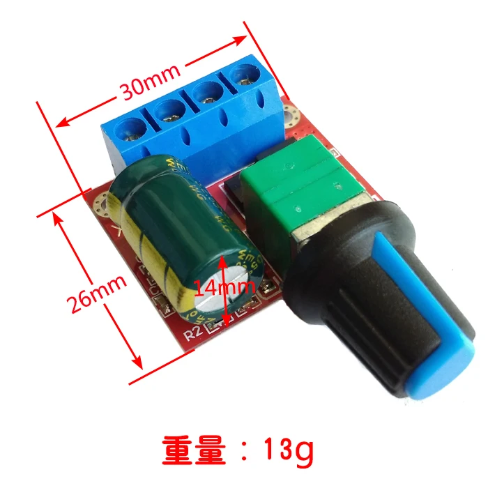 Технические характеристики: Рабочее напряжение: DC4.5V-35V Выход ток: 0-5A Выходная мощность: 90 Вт (макс.) Ток тишины: 7uA (в режиме ожидания) Рабочий цикл ШИМ: 1%-100% Частота ШИМ: 20 кГц Размер: 30 мм x 26 мм x 14 мм (без ручки) Меры предосторожности: Регулятор Двигателя пост. Тока вход постоянного тока, не может непосредственно подключенный к AC по причине непогоды (к примеру: Главная 220 В переменного тока), в противном случае он будет гореть! Источник питания постоянного тока положительные и отрицательные клеммы не поворачиваются, в противном случае регулятор может быть поврежден. Мотор может быть положительным или отрицательным, когда направление работы и ожидания не совпадают, вы можете отрегулировать линию, чтобы изменить направление. Отрегулируйте ручку потенциометра для изменения выходного цикла регулятора, скорость двигателя меняется. Посылка включает в себя: 1 x ШИМ контроллер скорости двигателя постоянного тока
