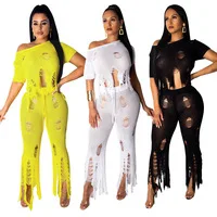 Новинка 2019, женский летний свитер с кисточками, короткий рукав, широкие штаны, костюм из двух частей, модный спортивный костюм