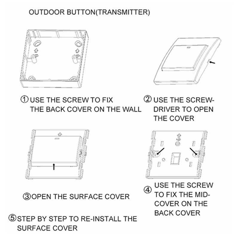 1. Нажмите кнопку, супер обучающий код может свободно научиться сочетать, может быть неограниченным подходящим приемником. 2. Если несколько кнопок соединены с одним или несколькими приемниками в одной системе, каждая кнопка может быть установлена на другой мелодии звонка. 3. Функция отключения памяти: Включите питание снова после выключения питания, не нужно повторно регулировать и блокировать мелодию звонка. 4. Передатчик не имеет винтового патрона, он может быть водонепроницаемым и пыленепроницаемым без резинового кольца. 5. Передатчик использует щелочную батарею 23A12V (не входит в комплект). 6. Напряжение приемника: 110-220-240в. 7. Приемник доступен в различных вилках, штепсельных вилках США/ЕС/Великобритании и адаптерах Австралии, подходит для большинства стран. 8. Расстояние приема: 300 метров на открытой местности. 9. На беспроводной сигнал будут влиять препятствия. Чем больше препятствий, тем серьезнее потеря сигнала. 10. Приемник имеет 5 уровней (можно отключить звук) 0-110 дБ, 60 музыки на выбор. 11. Размер передатчика: 86*86*33 мм 12. Размер приемника: 95*65*24 мм 13. Просто подключите приемник к электрической розетке, передатчик кнопки может быть приклеен к двери с помощью прилагаемых клейких лент. Примечание: Кнопка не может быть размещена на железной двери, потому что это будет мешать сигналу.