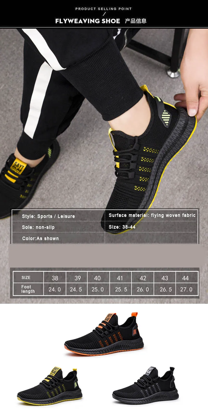 Размер: 39,40, 41,42, 43,44 Цвет: оранжевый, белый, желтый Посылка включает в себя: 1 x мужская повседневная обувь Характеристики: дышащая, мягкая и удобная Модные мужские кроссовки Дышащая Спортивная обувь