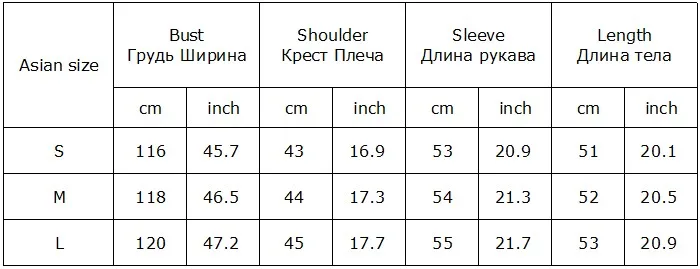 1. Пожалуйста, строго следуйте таблице размеров, чтобы выбрать размер. Не выбирайте напрямую в соответствии с вашими привычками. 2. Все еще не уверены в размере? Советуем основываться на собственных измерениях обхвата груди, плеч и рукавов. 3. Размер может отличаться на 2-3 см из-за ручного измерения. Обратите внимание при измерении.