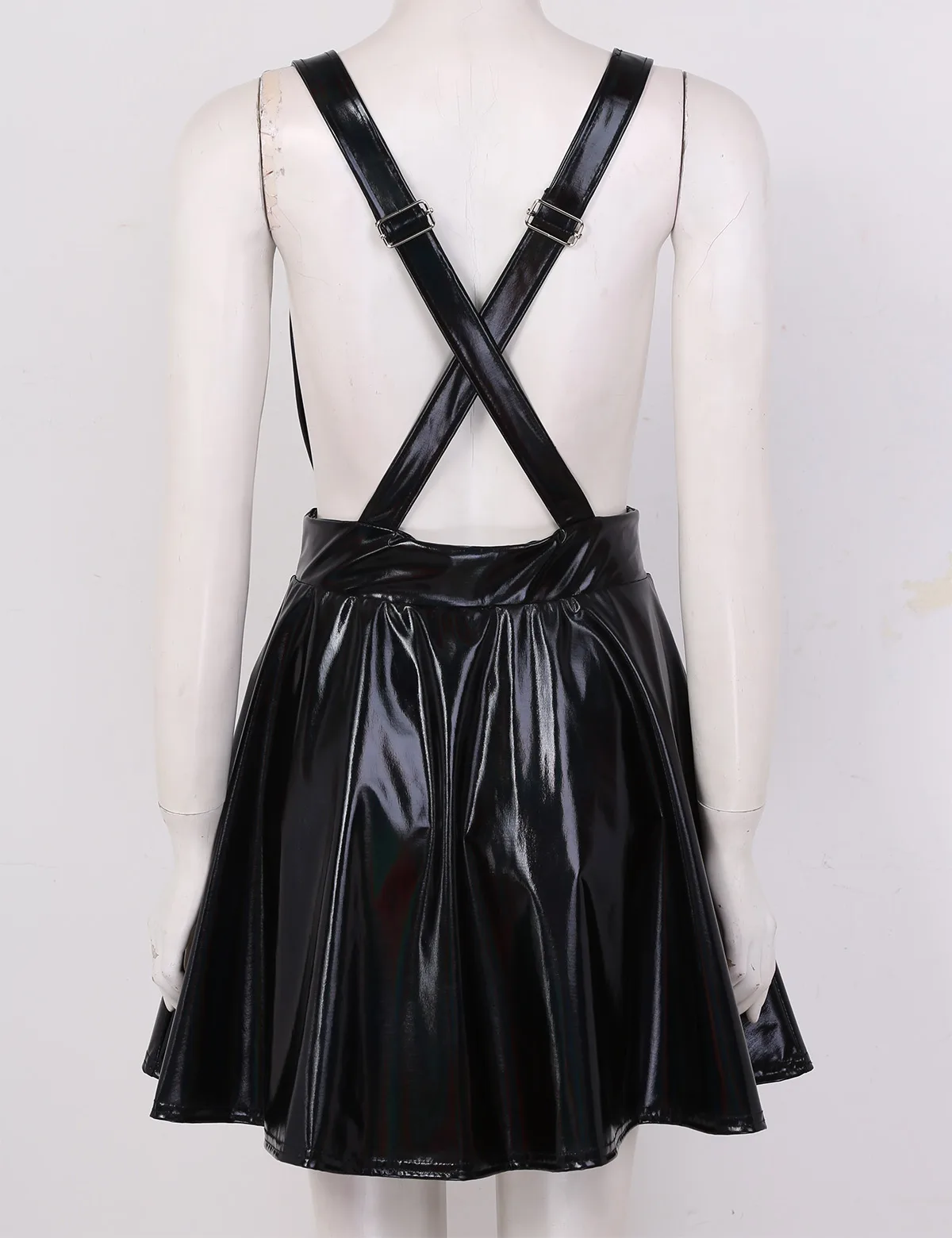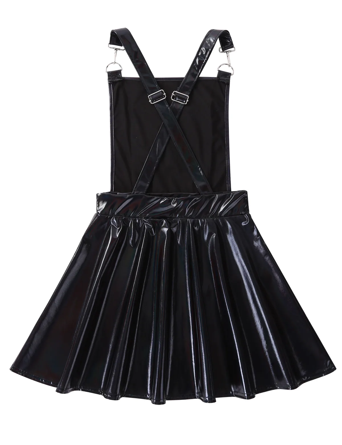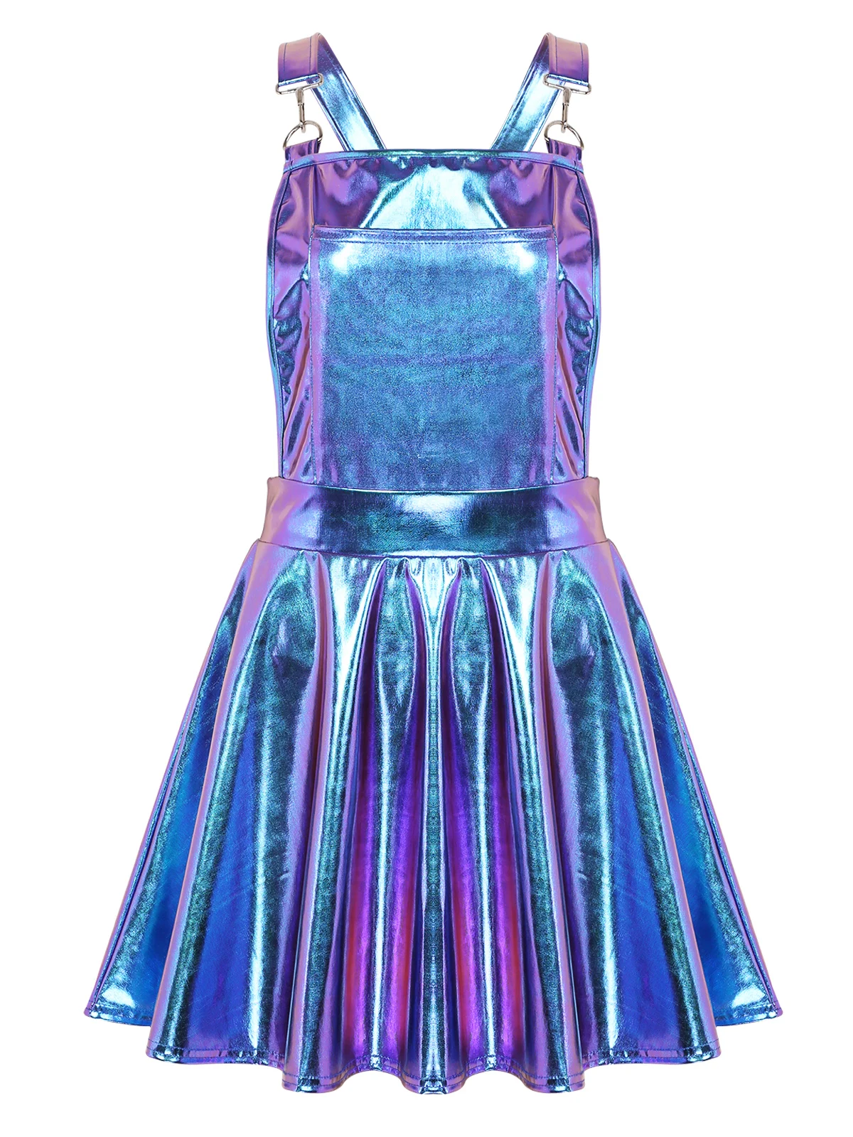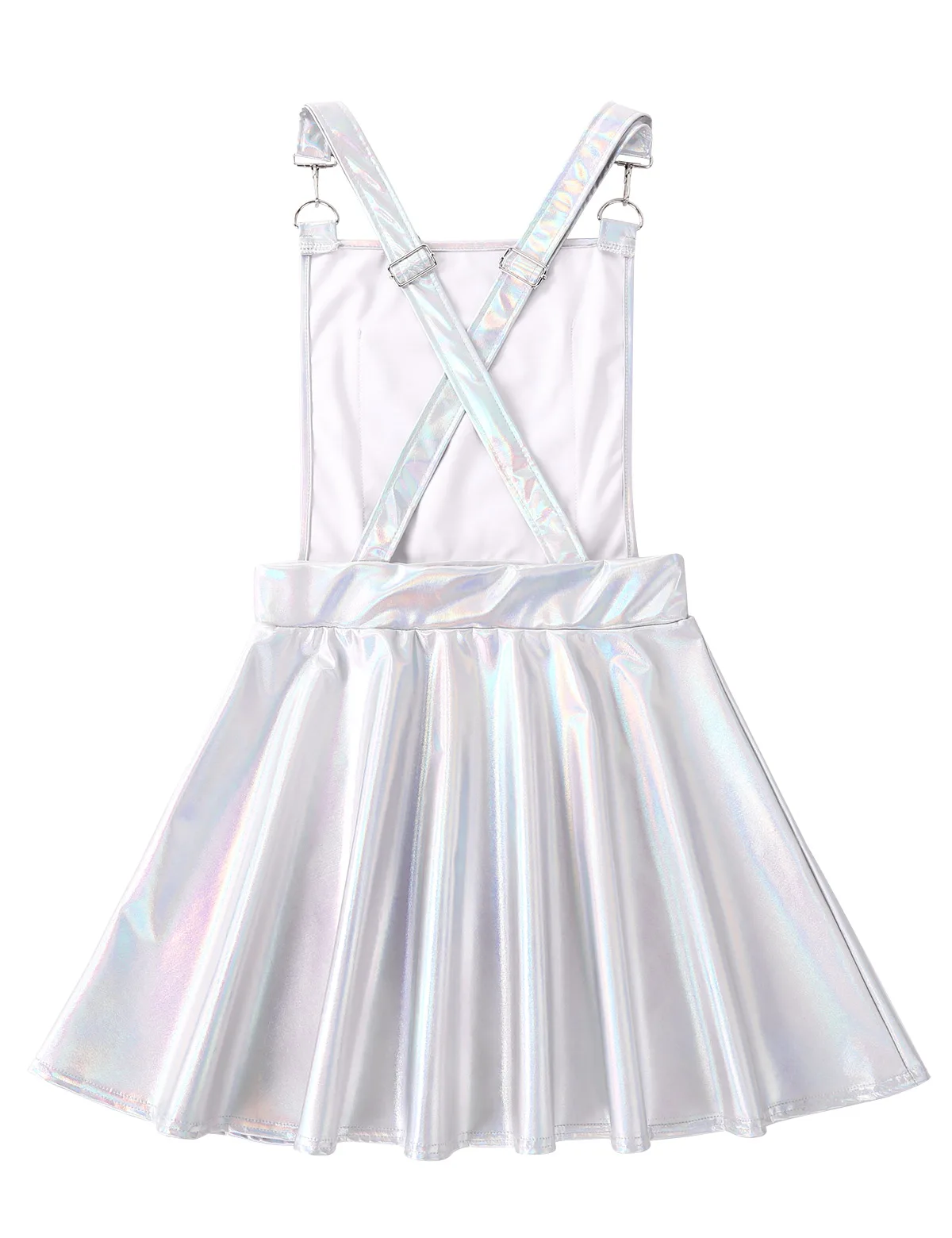 Женский Блестящий металлический комбинезон на лямках, платье-сарафан, юбка-мини подвязки, надежная застежка