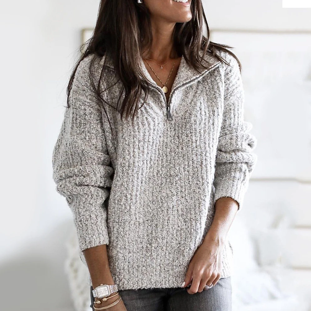 Женский свободный трикотажный пуловер на молнии с отворотом, Однотонный свитер с длинным рукавом