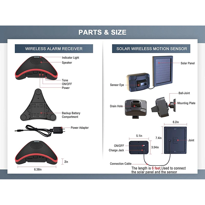 Полностью расширяемая система-В комплект входят датчик движения на солнечной батарее и приемник сигнализации с питанием от переменного/переменного тока. Расширен до 32 датчиков и неограничен приемник сигнализации, чтобы покрыть вашу ценность. Доступны 4 регулировки уровня громкости и 35 мелодий звонка. Различные мелодии звонка соответствуют различным датчикам вокруг свойства, чтобы различить, где обнаруживаются движения.