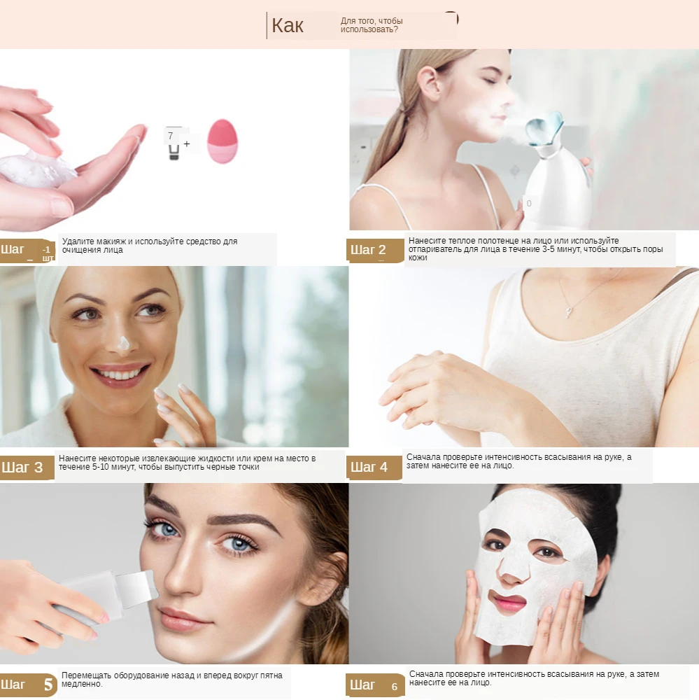 Шаг 1: удалите макияж и используйте очищающее средство для лица, чтобы очистить лицо Шаг 2: нанесите теплое полотенце на лицо или используйте пароварку для лица в течение 3-5 минут, чтобы открыть поры кожи Шаг 3: Нанесите несколько жидкостей или крема на место в течение 5-10 минут, чтобы высвободить черные точки Шаг 4: сначала проверьте интенсивность всасывания на руке, а затем нанесите ее на лицо. Шаг 5: медленно перемещайте оборудование вперед и назад вокруг места. Шаг 6: после очистки лица нанесите маску для лица или жидкость для сужения пор