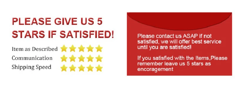 1. Пожалуйста, оставьте 5 звезд отзывы, если вы удовлетворены нашей продукцией и обслуживанием, Мы будем признательны (товар, как описано 5 звезд, связь 5 звезд, время доставки 5 звезд). 2. Если продукты, которые вы получили, были повреждены или неправильные стили, пожалуйста, немедленно свяжитесь с нами, мы разберемся с этим и разработаем лучшие решения, Ваше удовлетворение-это наше движение, чтобы сделать лучше.