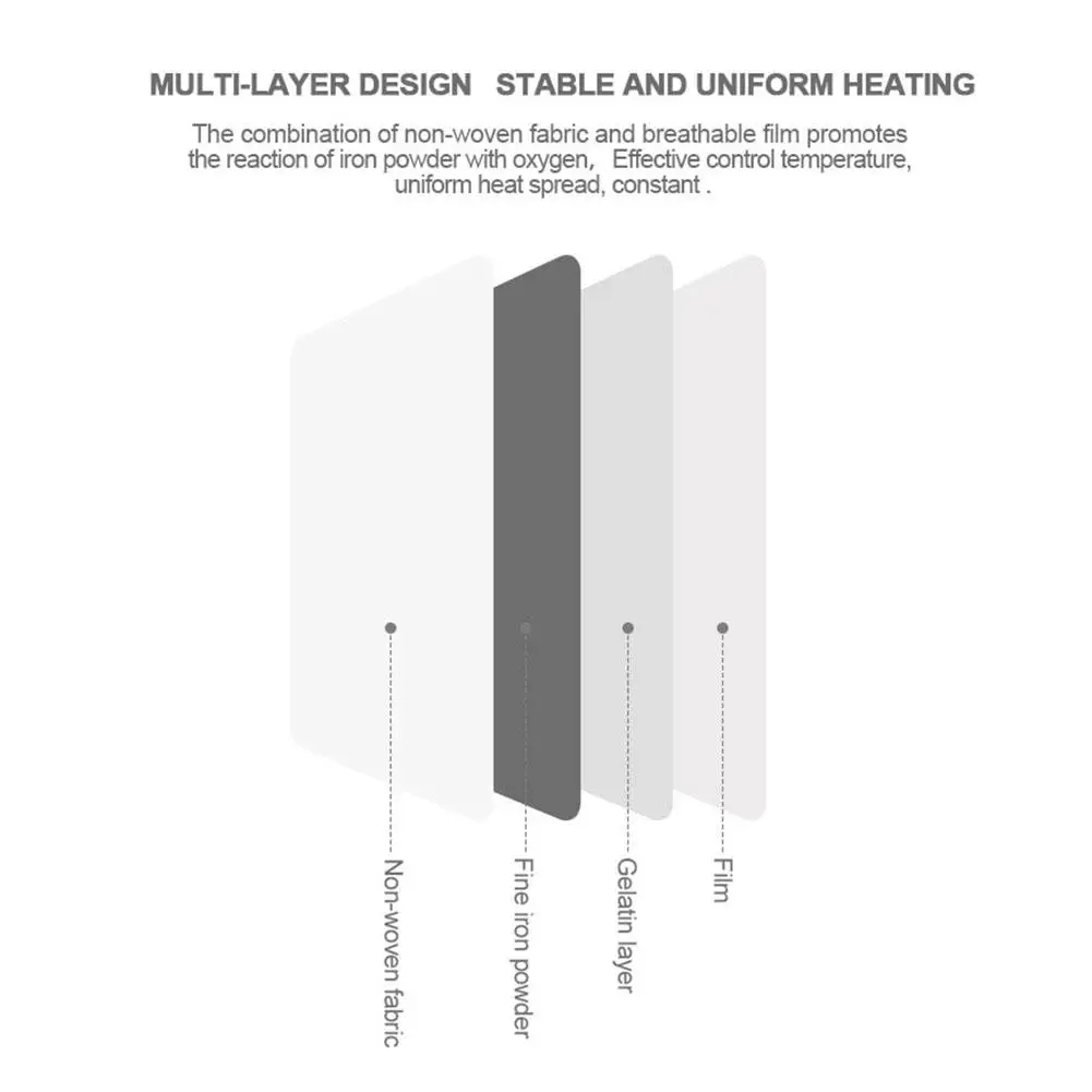 3 、 3. Многослойная конструкция, стабильный и равномерный нагрев. Сочетание нетканого материала и дышащей пленки лучше повышает реакцию железного порошка и кислорода, чтобы эффективно контролировать температуру и сделать ее долговечной.