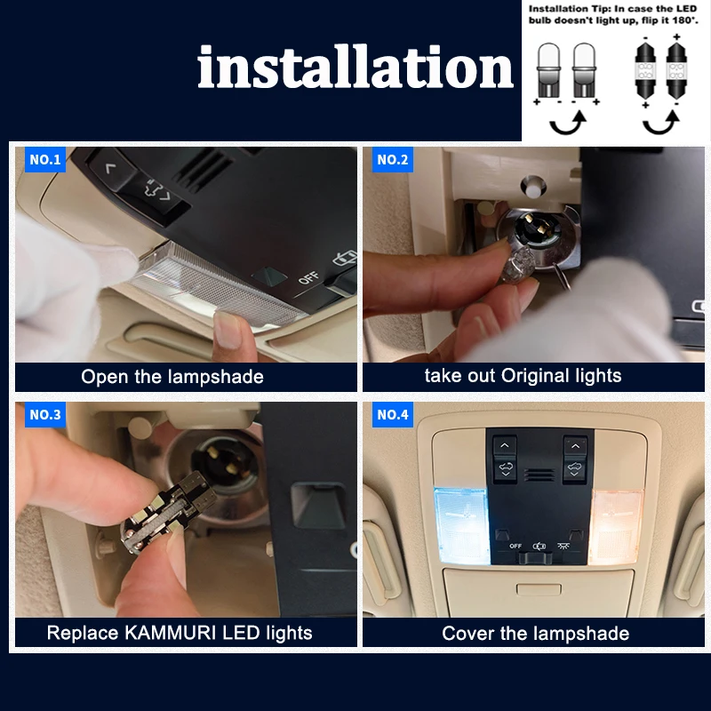 1. Пожалуйста, выключите светильник перед установкой и будьте осторожны при снятии запасной лампы, она может быть очень горячей. 2. Просто снимите свою старую лампу и установите Новый светодиодный лампочку на своем месте. Если светильник не сразу включится, переверните его на 180 градусов. 3. Пожалуйста, пожалуйста, переместите металлические зажимы ближе, чтобы они могли установить festoon более жесткий чехол лампа немного свободно в розетке