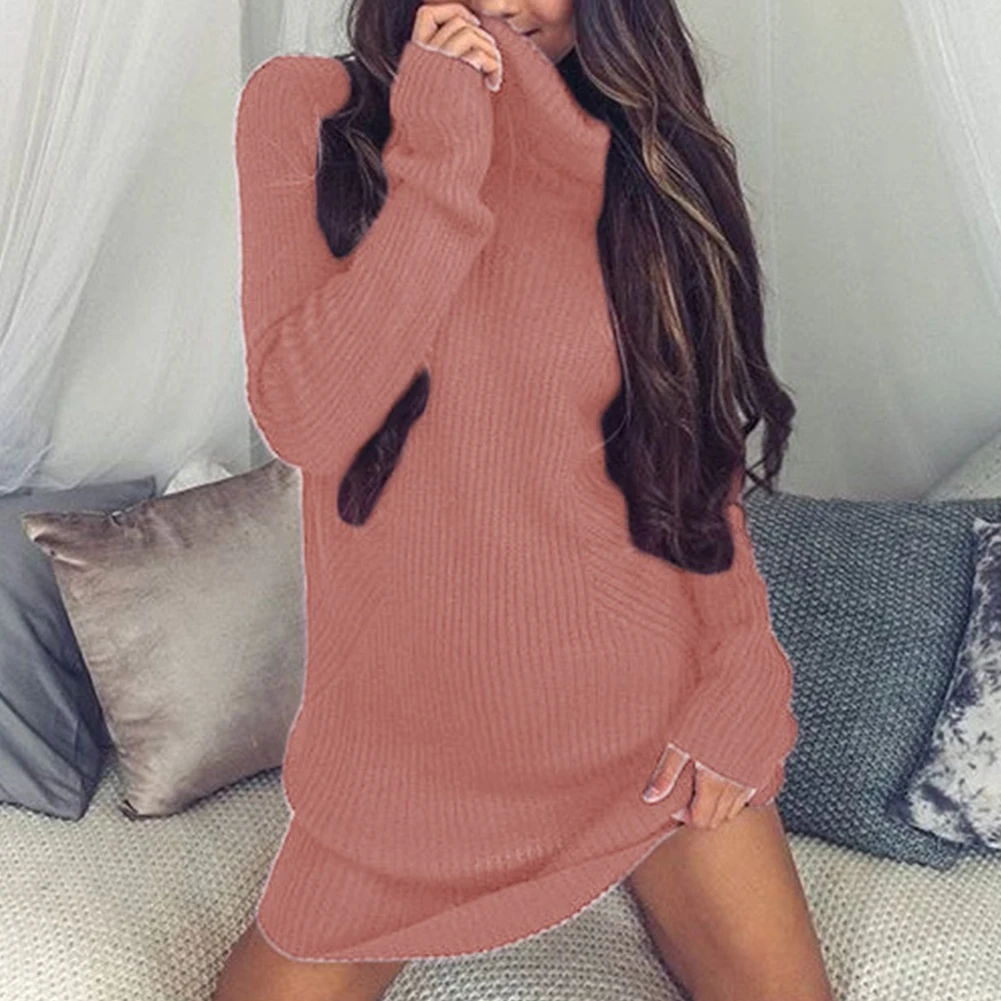 Повседневный женский сплошной цвет черепаха шеи свободный ребристый вязаный свитер мини-платье