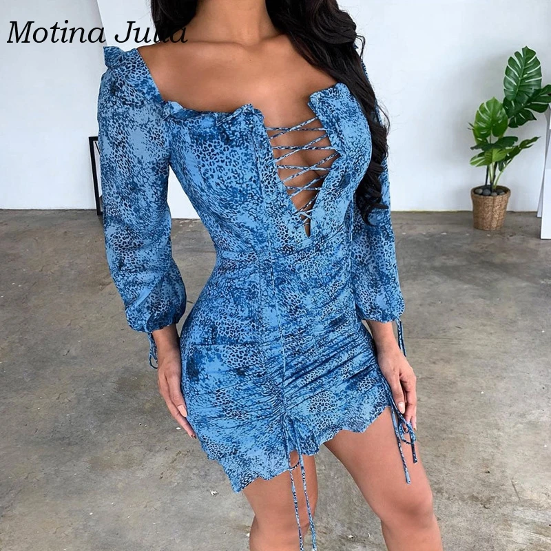 Мотина Юлия шикарный принт с открытыми плечами платье для женщин с оборками на шнуровке мини-платье вечерние Клубные женские платья Длинные рукава