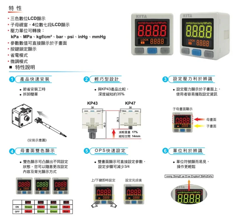 KITATable имеет две функции:1. Функция манометра (подключите источник питания и трахею) 2. Функция переключателя давления (с выходом npnswitch)