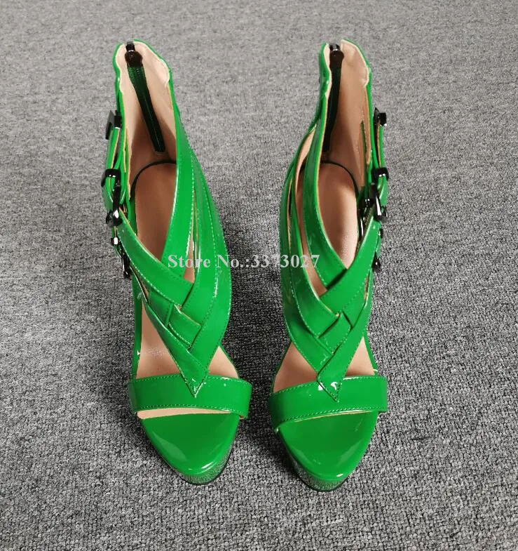 Пикантные Зеленые босоножки из лакированной кожи с перекрестными ремешками на шпильках и платформе; Женские модные сандалии-гладиаторы с пряжкой; Женские вечерние туфли с реальными фотографиями; Прямая поставка