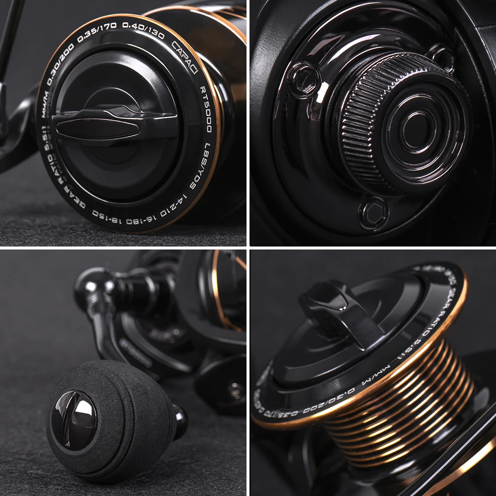 | RT5000 | 13 + 1 | 5,5: 1 | 7,5 кг/17lb | 0,30 мм/200 м, 0,35 мм/170 м, 0,40 мм/130 м | 303 г/10,7 унций |