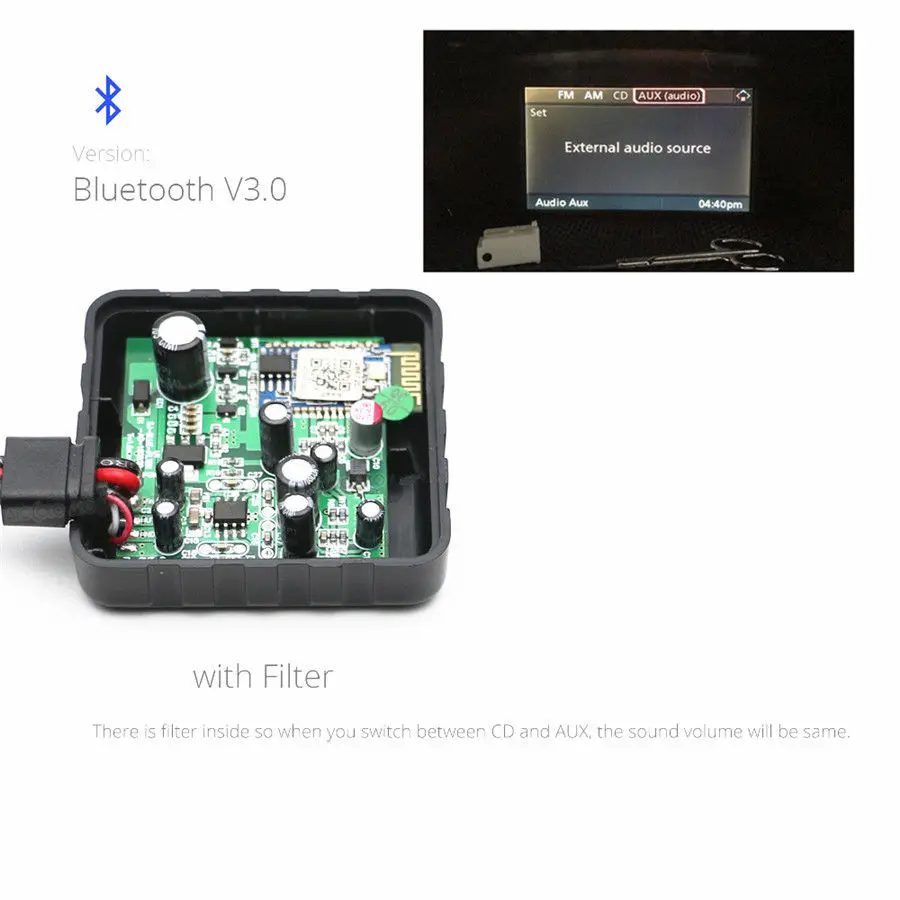 С фильтром: BT-BMW-E60-F (внутри есть фильтр, поэтому при переключении между CD и AUX громкость звука будет одинаковой.)