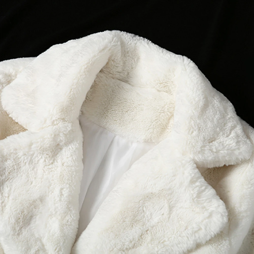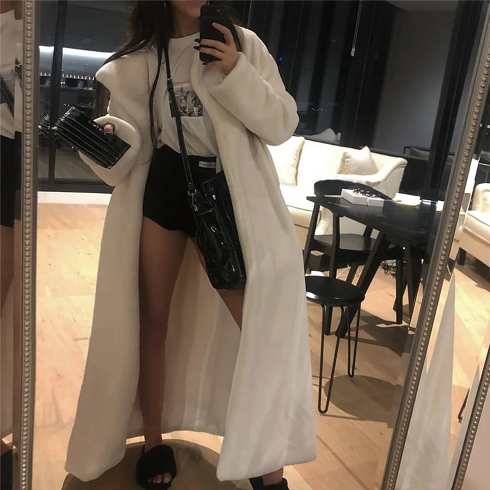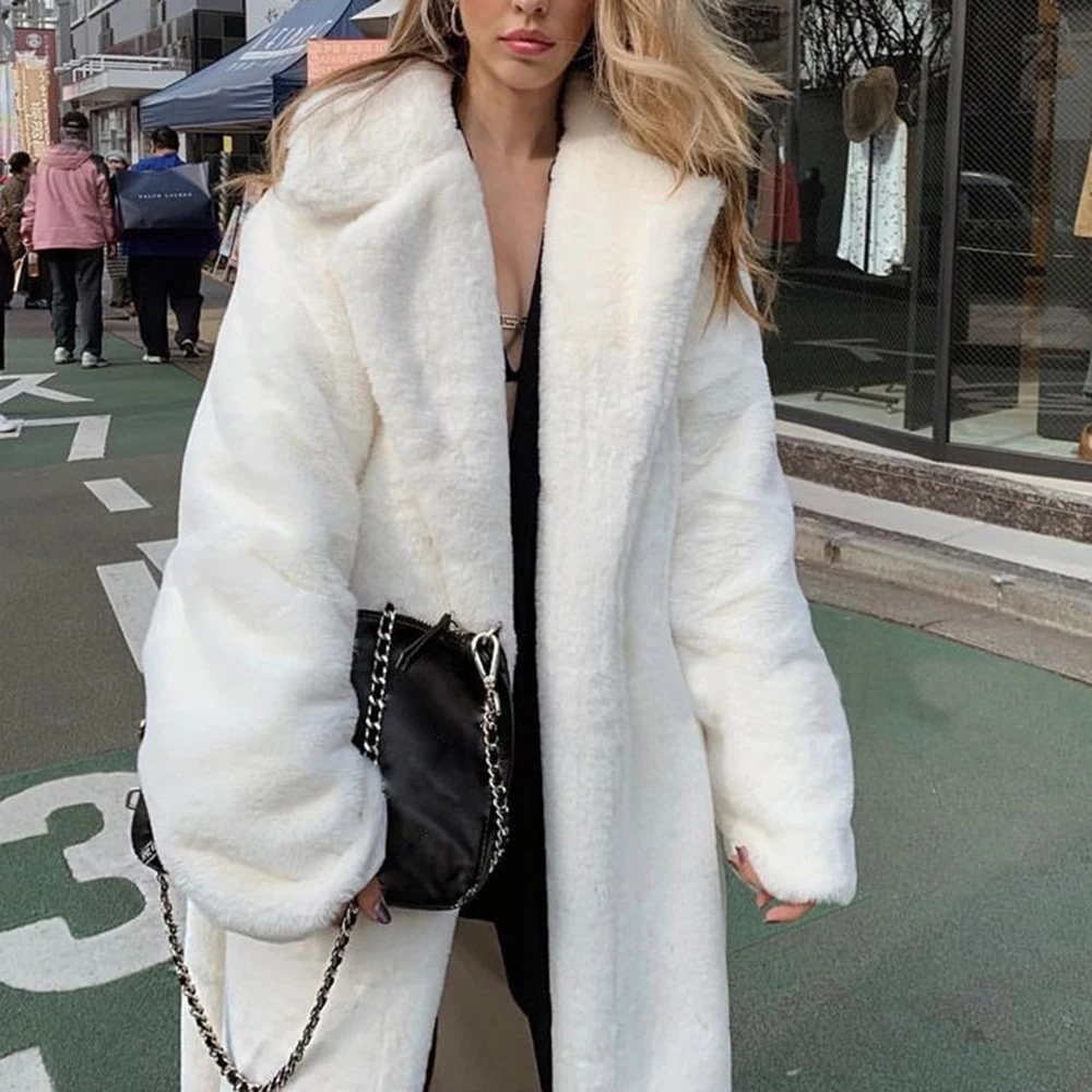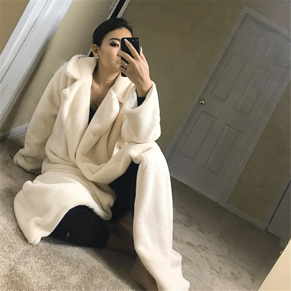 Зимнее пальто из искусственного кроличьего меха, женское роскошное белое длинное меховое пальто, Свободное пальто с отворотом, толстое теплое пальто, плюс размер, женские плюшевые парки, пальто
