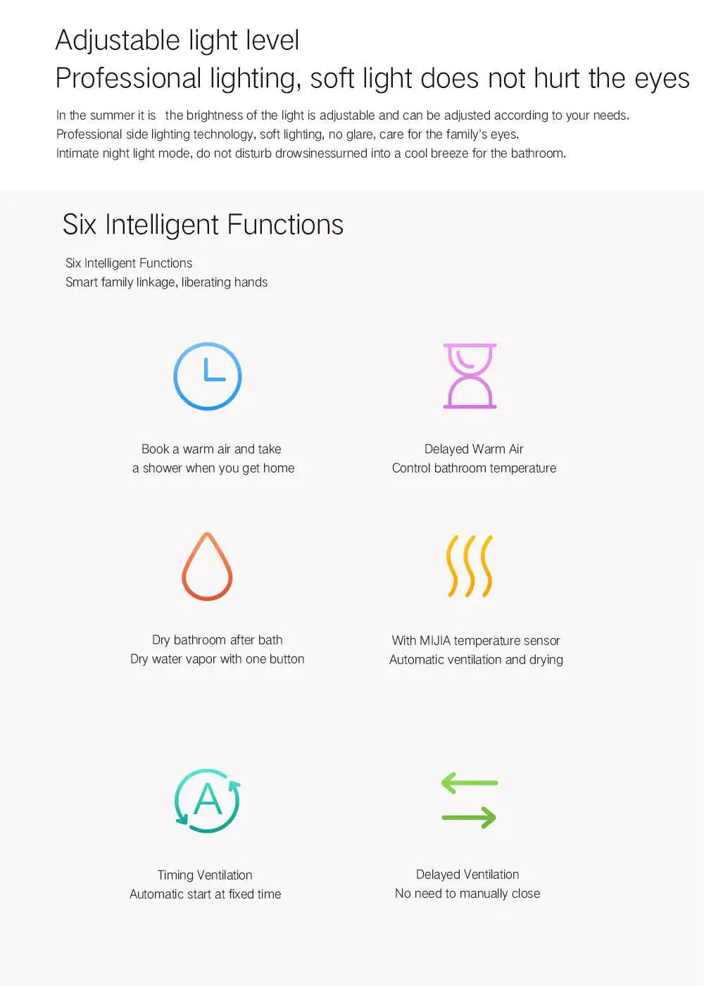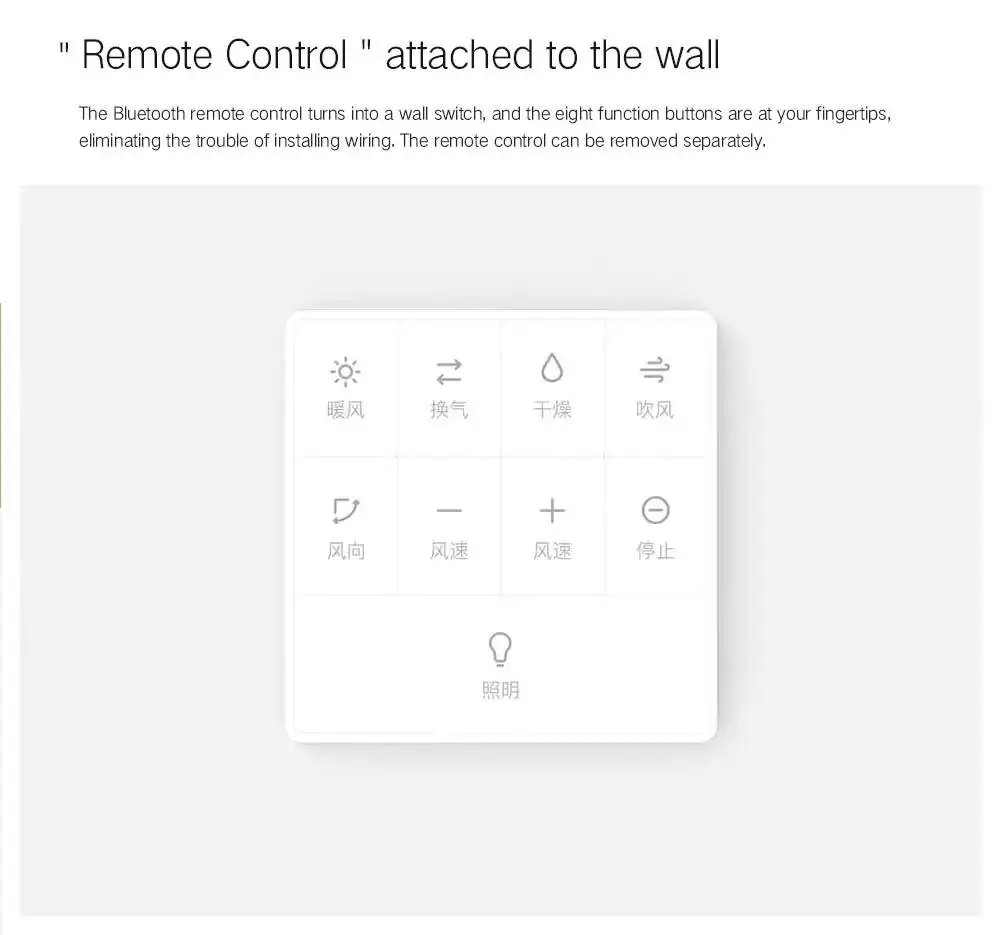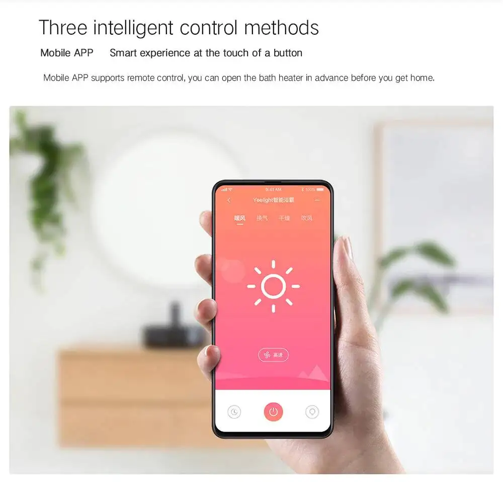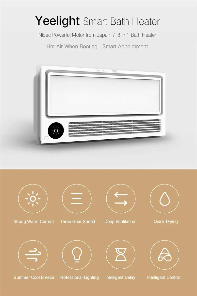Параметры: -Модель продукта: YLYB01YL -Цвет изделия: белый + серый -Материал: PBT + 15 процентов GF + V0/PP V2/полипропилен/АБС-пластик V2 -Регулировка яркости: регулируемая яркость -Название приложения: MIJIA -App store скачать -Индекс цветопередачи: 80 и более -Источник питания Светильник: 15W -Мощность мотора: 30 Вт -Номинальная мощность: 2250 Вт -Мощность нагрева: 2200 Вт -Объем вентиляционного воздуха: 240 m⊃3;/ч -Уровень защиты: подогреватель ванны IPX2/пульт дистанционного управления IPX4 -Режим управления: Управление мобильным телефоном/Голосовое управление/дистанционное управление/кнопочное управление