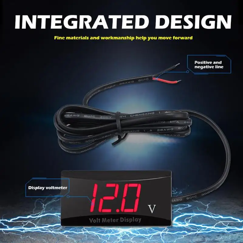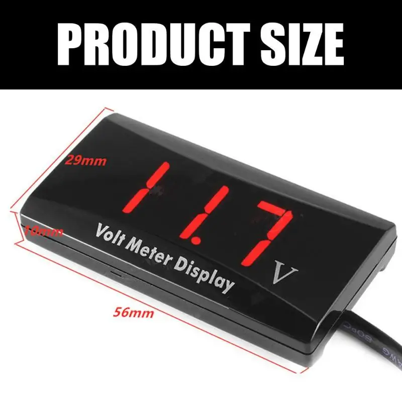 12 В водонепроницаемый цифровой дисплей светодиодный вольтметр автомобиля мотоцикла Напряжение Вольт Калибр Панель метр Особенности: 1. Точный дисплей напряжения, длительный срок службы. 2. Толстые положительные и отрицательные линии, низкое энергопотребление, более прочный. 3. Стабильный эффект отображения. 4. Отборные материалы, тонкая работа. Технические характеристики: Материал: АБС + электронные компоненты Вес: 27 г Светодиодный Цвет: красный/белый/синий Измерительное напряжение: 8-16 В Примечания: 1. Возможны незначительные отклонения в размере из-за ручного измерения, различных методов измерения и инструментов. 2. Изображение может не отражать фактический цвет изделия из-за различных фотографий светильник, угол и монитор дисплея.