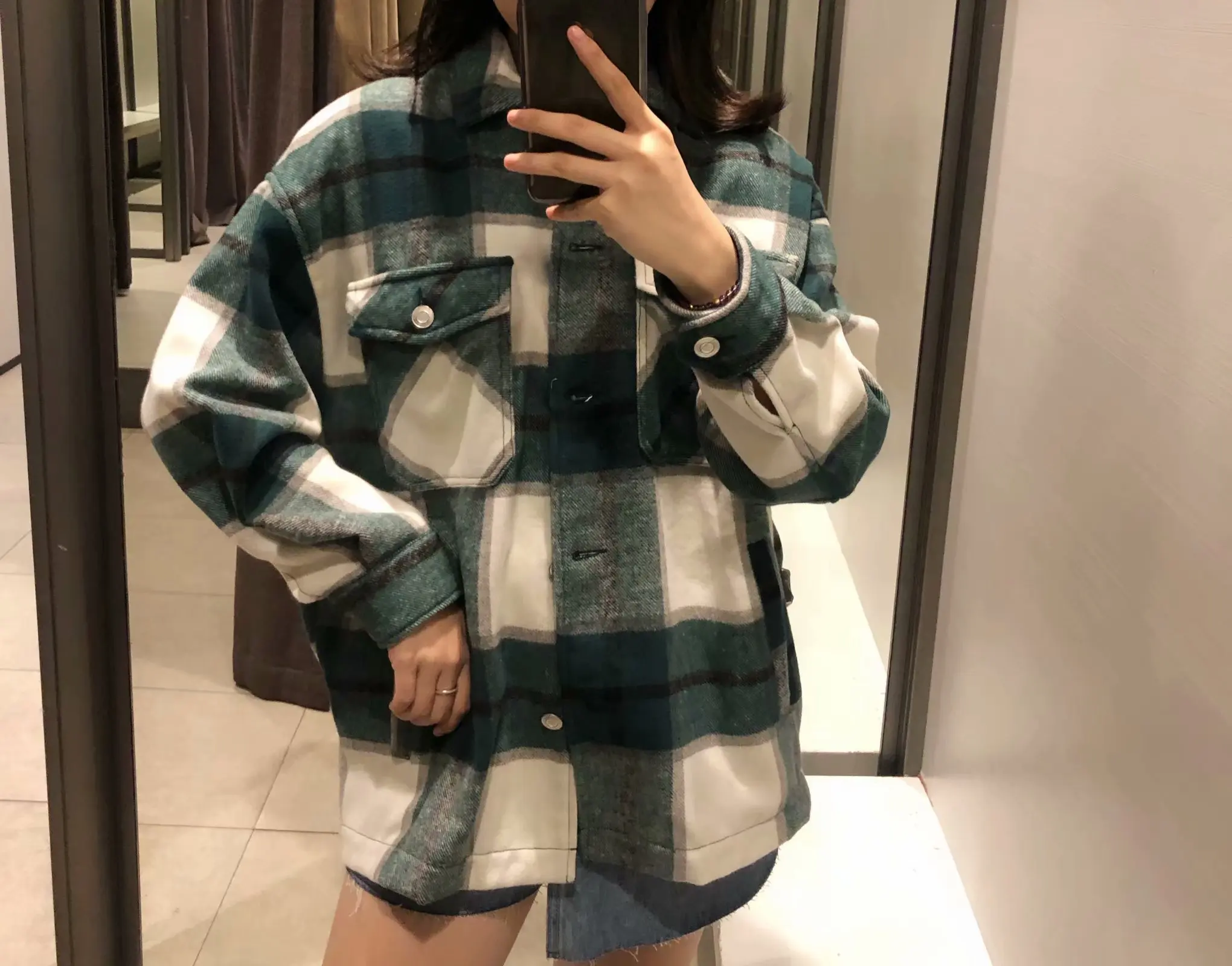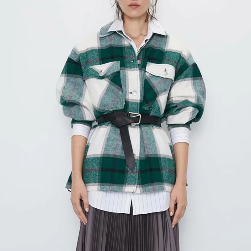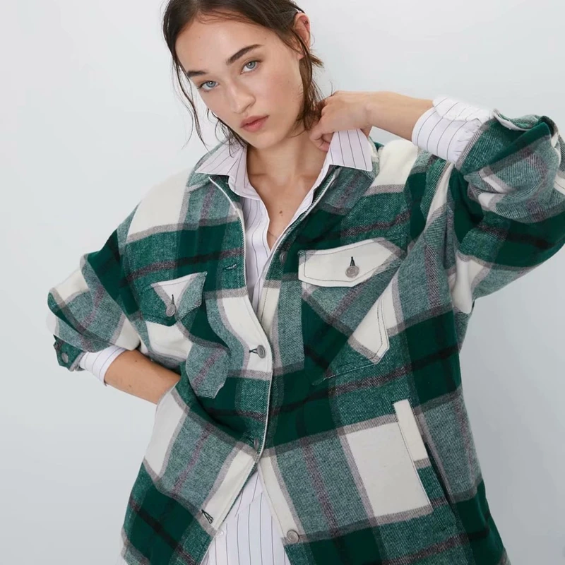 Женская куртка оверсайз в зеленую клетку, свободная куртка
