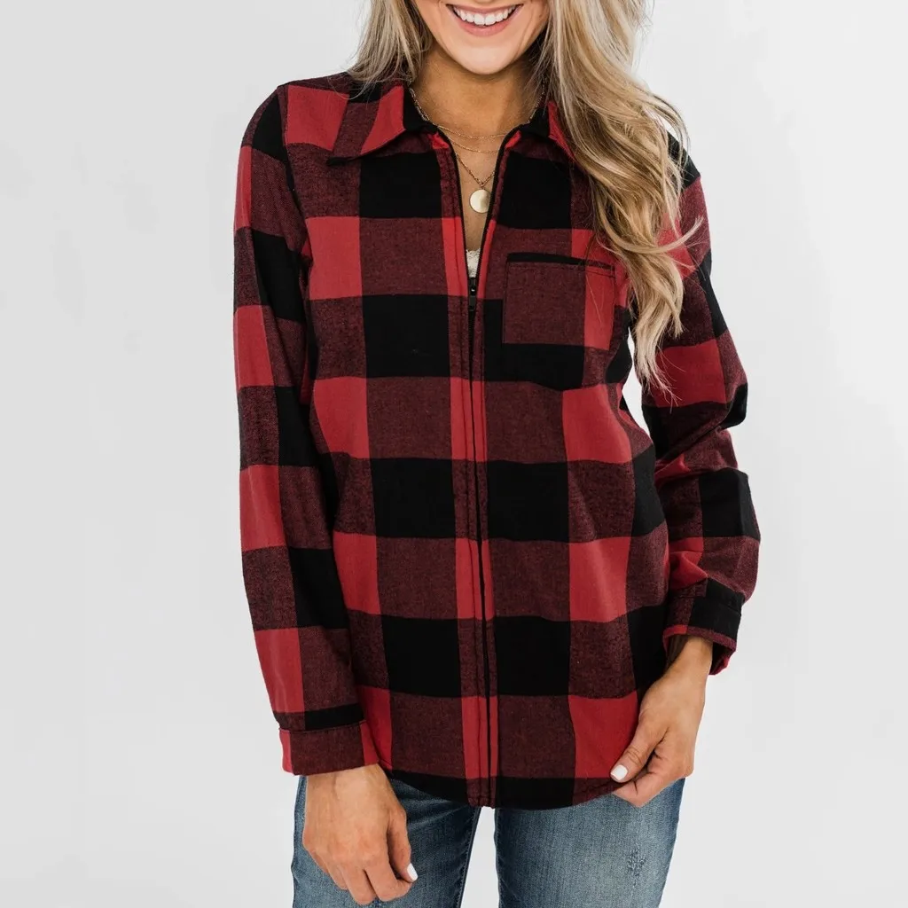 Модные женские повседневные толстовки с длинным рукавом на молнии, клетчатые топы с карманами, пальто