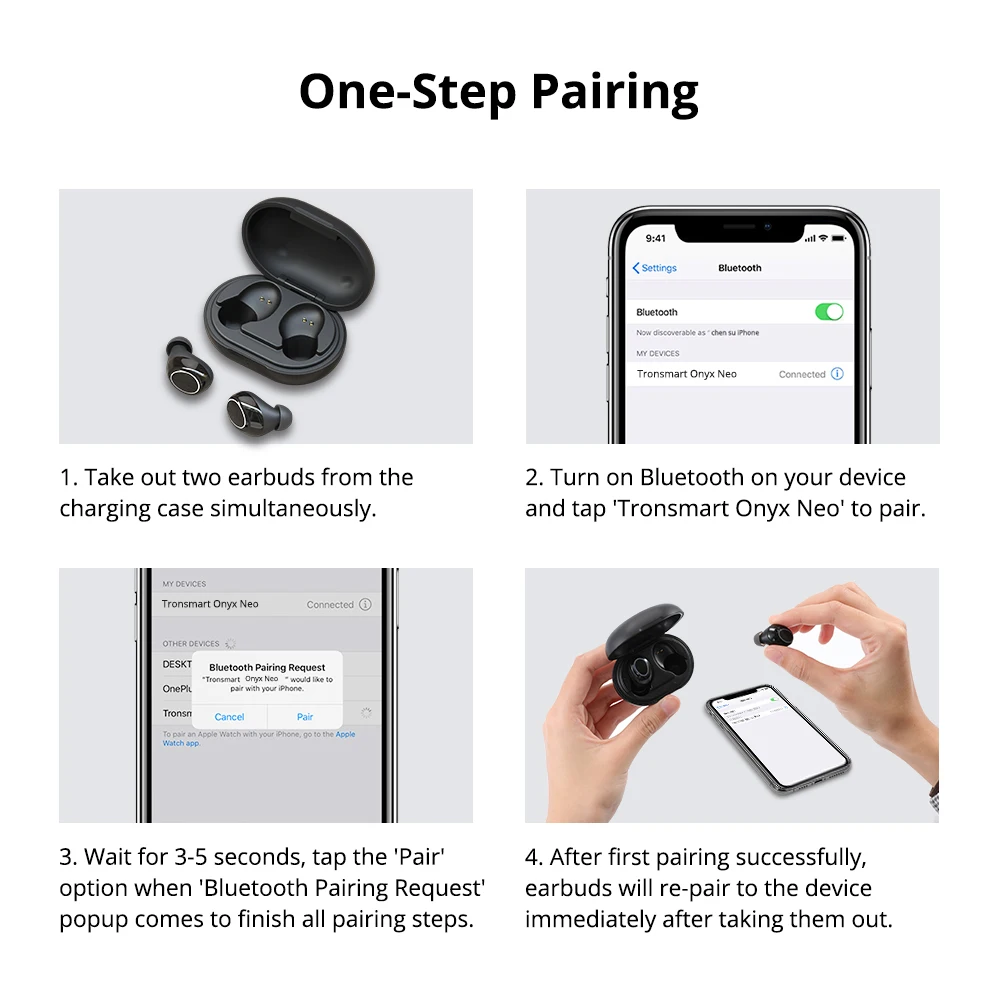 1. Извлеките оба вкладыша из зарядный чехол одновременно. 2. Включите Bluetooth на вашем устройстве и нажмите Tronsmart Onyx Neo' для сопряжения. 3. Подождите 3-5 секунд, коснитесь опции «pair», когда появится запрос на Сопряжение Bluetooth, чтобы завершить все шаги сопряжения. 4. После успешного первого сопряжения наушники будут повторно подключены к устройству сразу же после их снятия.Спецификация