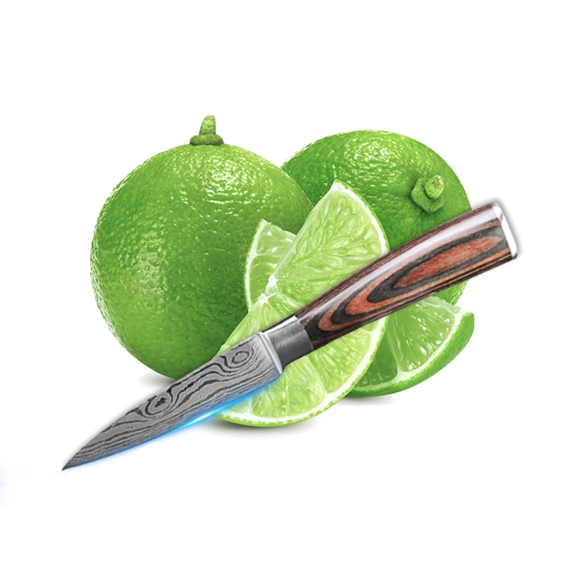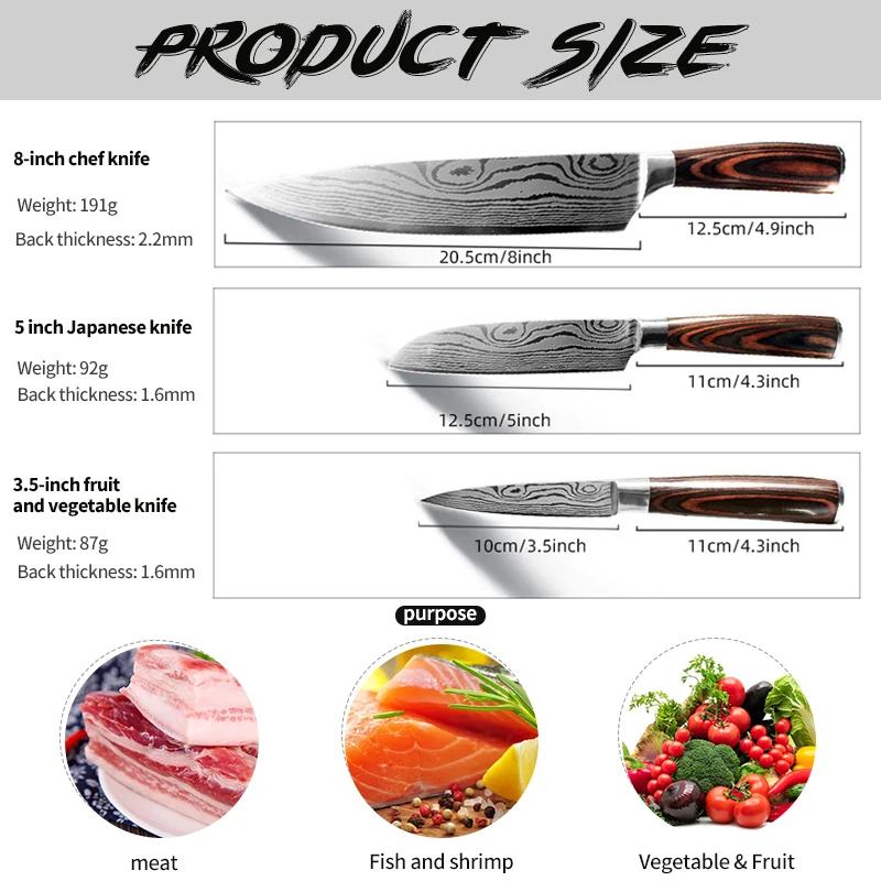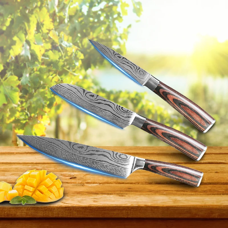 Характеристики: Материал лезвия: нержавеющая сталь X55CrMo14 Ручка: Pakka поверхность древесины: шлифовальный лазер дамасский узор комплектация: 1*8 дюймов нож шеф-повара 1*5 дюймов нож santoku 1*3,5 дюймов Фруктовый нож 3 шт. набор ножей