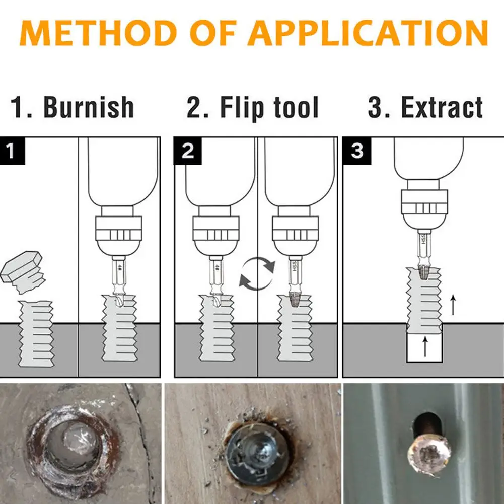 【Простота в использовании】Всего два простых шага сделают работу-Используйте подходящий размер отвертки для сверления отверстия с размером резки и его'Легко извлекать винт или болт с помощью экстрактора.