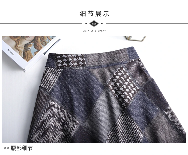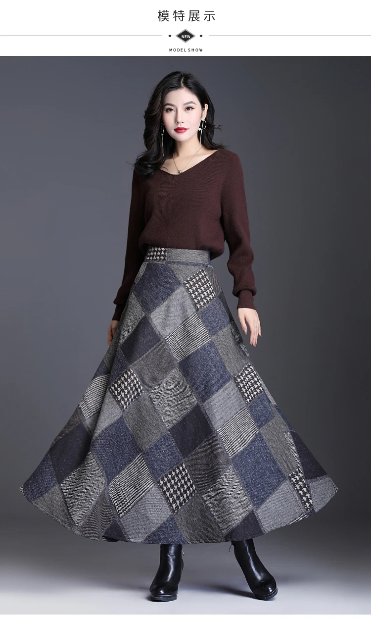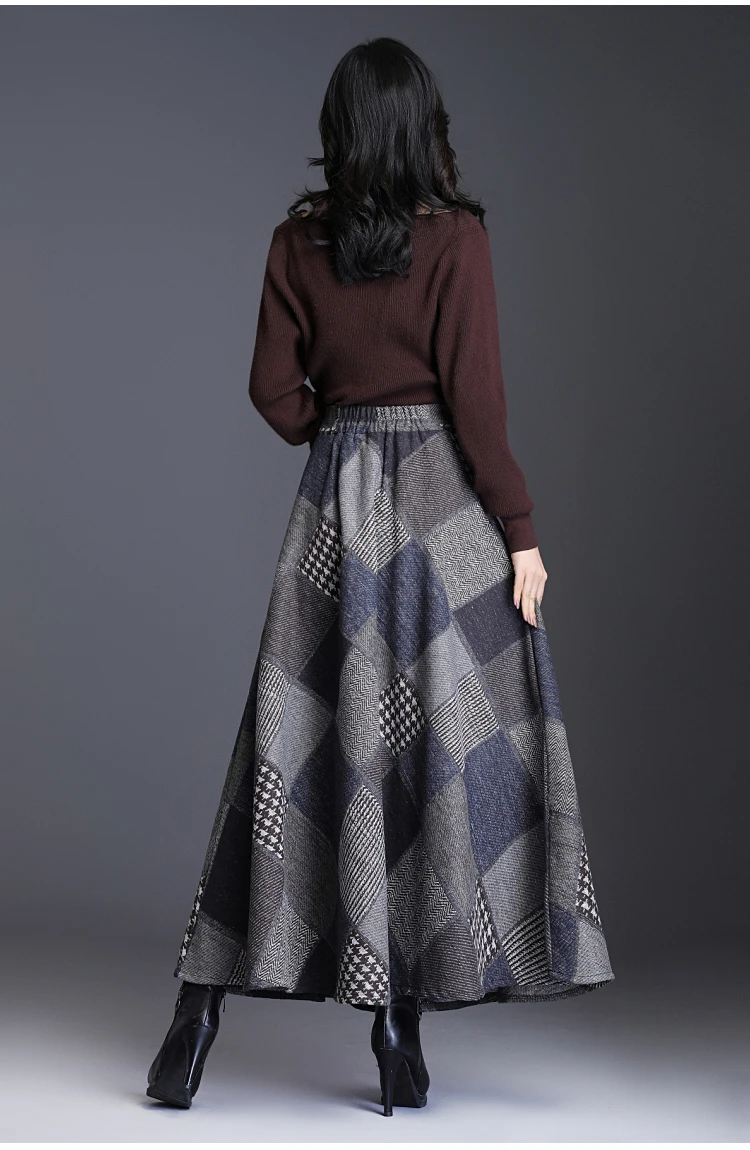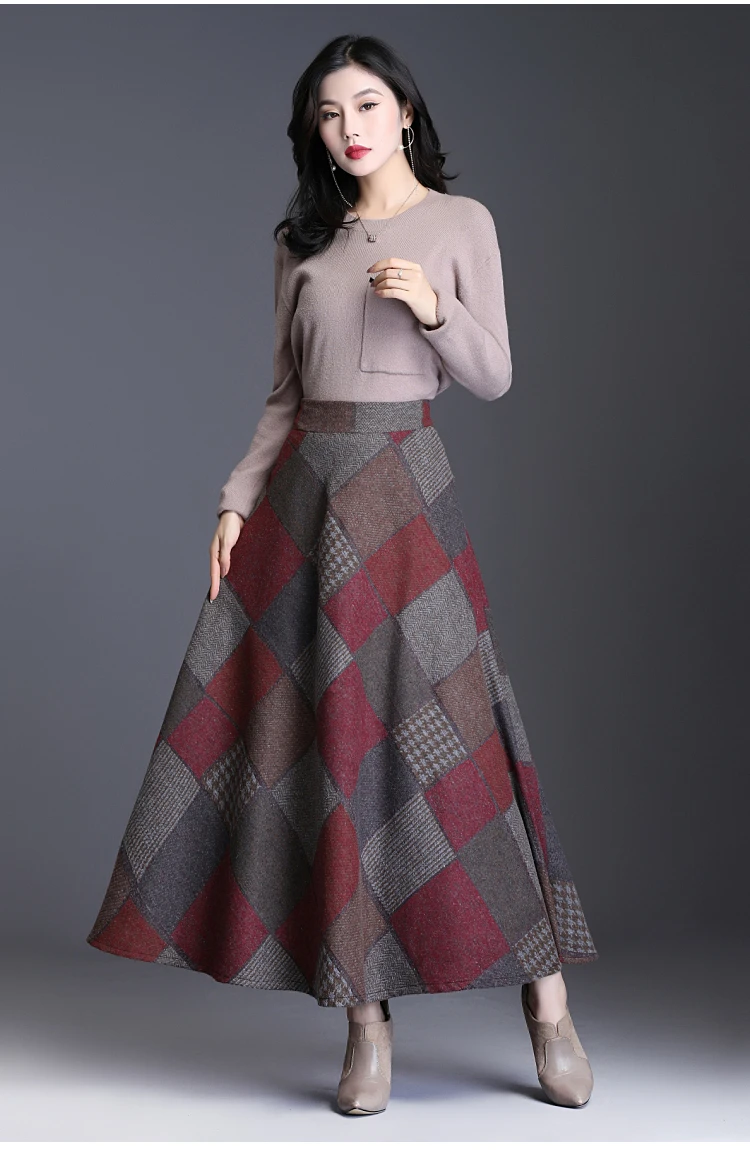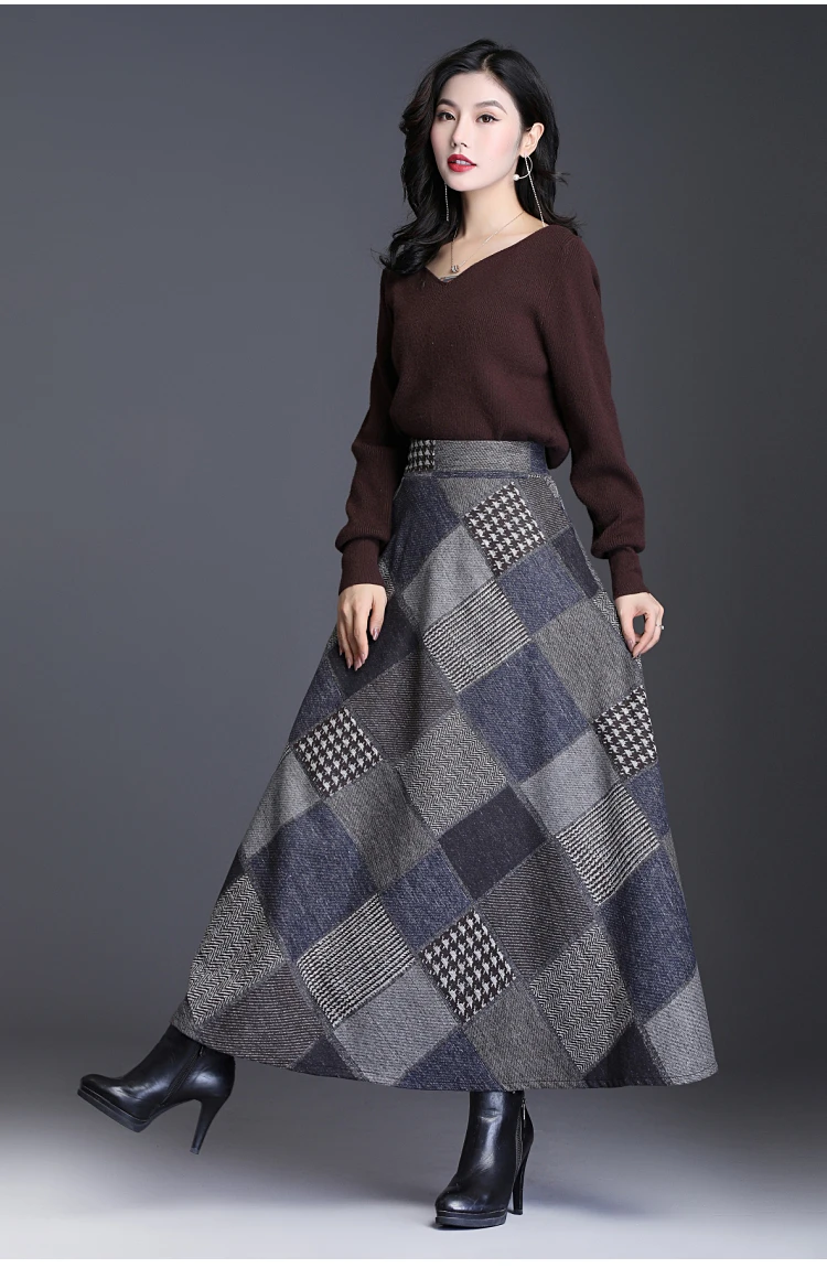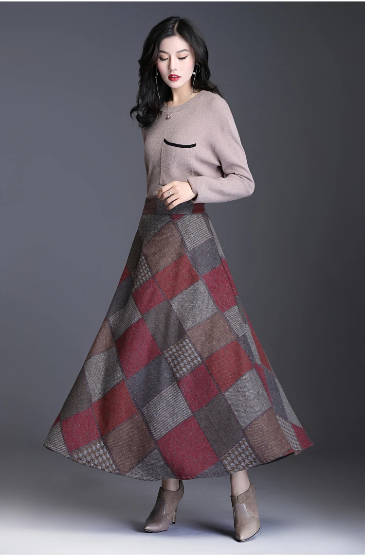 Осенне-зимние юбки, Женская шерстяная клетчатая юбка, женская элегантная винтажная длинная юбка макси с высокой талией, шерстяная клетчатая юбка
