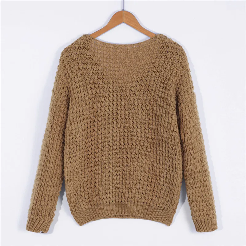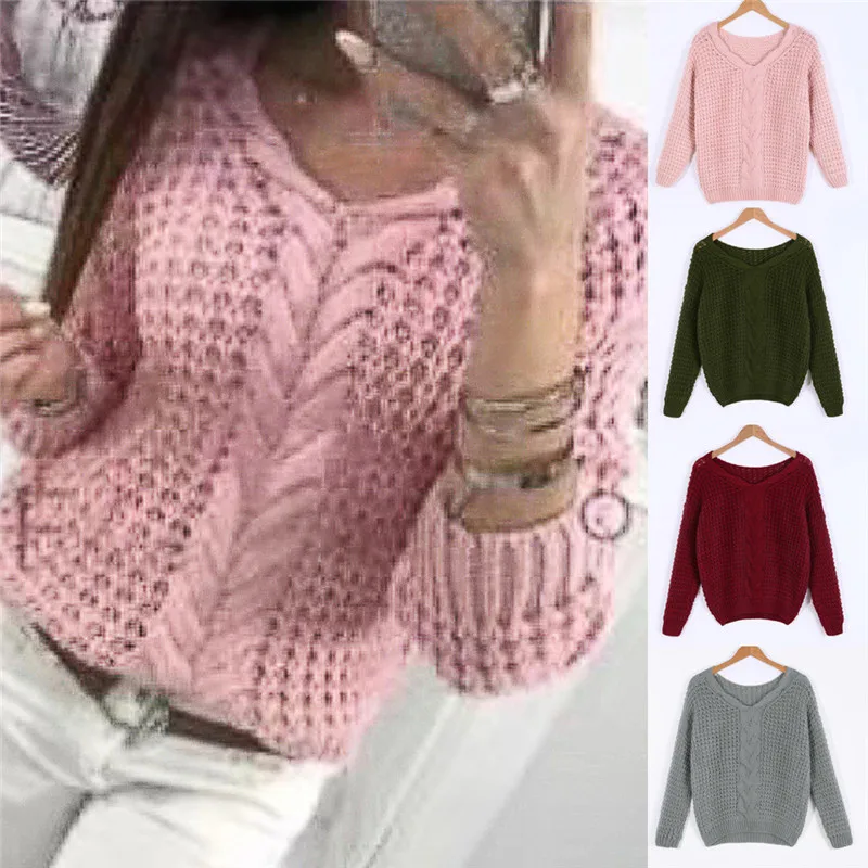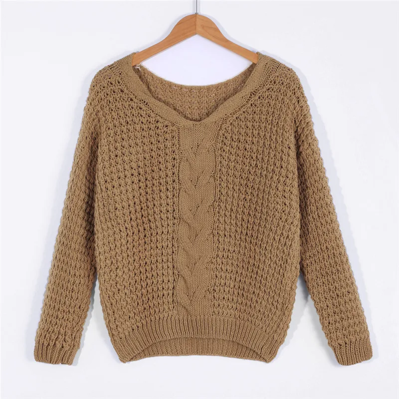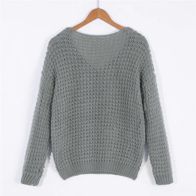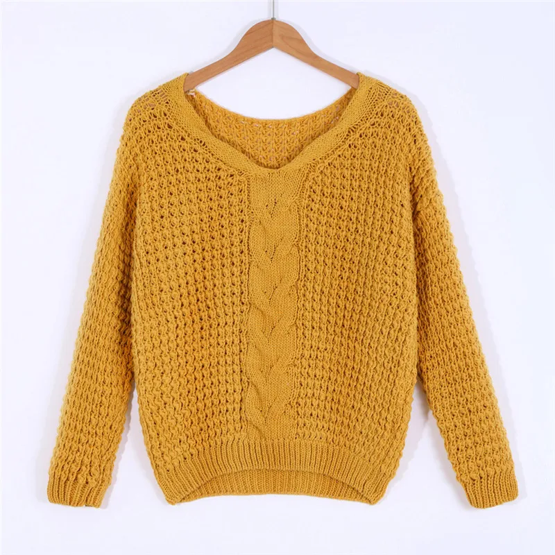 Fashion Women Solid V-Neck Long Sleeve Pullover Loose Thickened Sweater