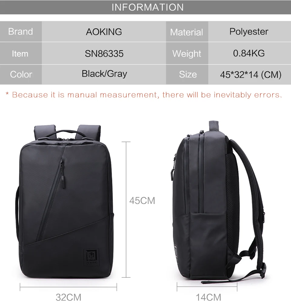 Название брендаAokingНомер моделиSN86335СтильНа каждый деньТип товарарюкзакТип рисункаСплошнойДекоративные элементыNONEТехнические приемыBartack StitchОбъем20-35 ЛОсновной материалНейлонПолУнисексТип застежкиМолнияМатериал подкладкиПолиэстерТип рюкзакаМягкая спинкаВнутренняя частьВнутренний карманный отсекВнутренняя частьКарман для мобильного телефонаВнутренняя частьВнутреннее отделениеВнутренняя частьПромежуточный слойВнешнийКарман без застежкиНесущая системаДугообразное плечоКрышка дождяНетТип ручки/ремняМягкая рукояткаЕдиница измерения100000015Количество1Main MaterialNylonLining materialPolyesterInteriorCell phone pocketPattern typeSolidHandle typeSoft handleFutureWaterproof,convenient pocket for transportation card,adjustable buckleColorBlack,GreySize12.60''*5.51''*17.72''(32*14*45cm)Fit for the laptop15.6''Carrying SystemArcuate Shoulder Strap