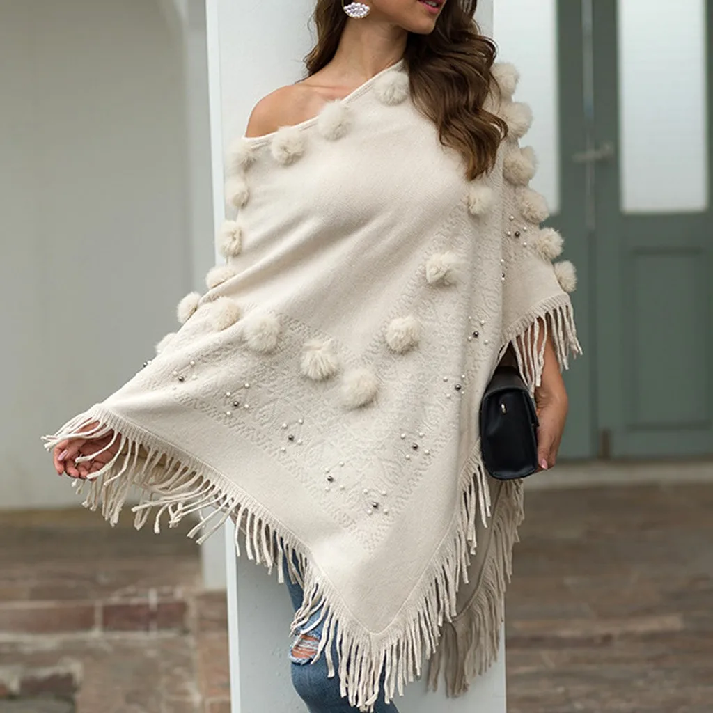 Women O-Neck Solid Hairball Tassel Sweater Autumn Vintage Cardigan Fashion Coat Loose Knitted Shawl Poncho Ladies Clothes#N
