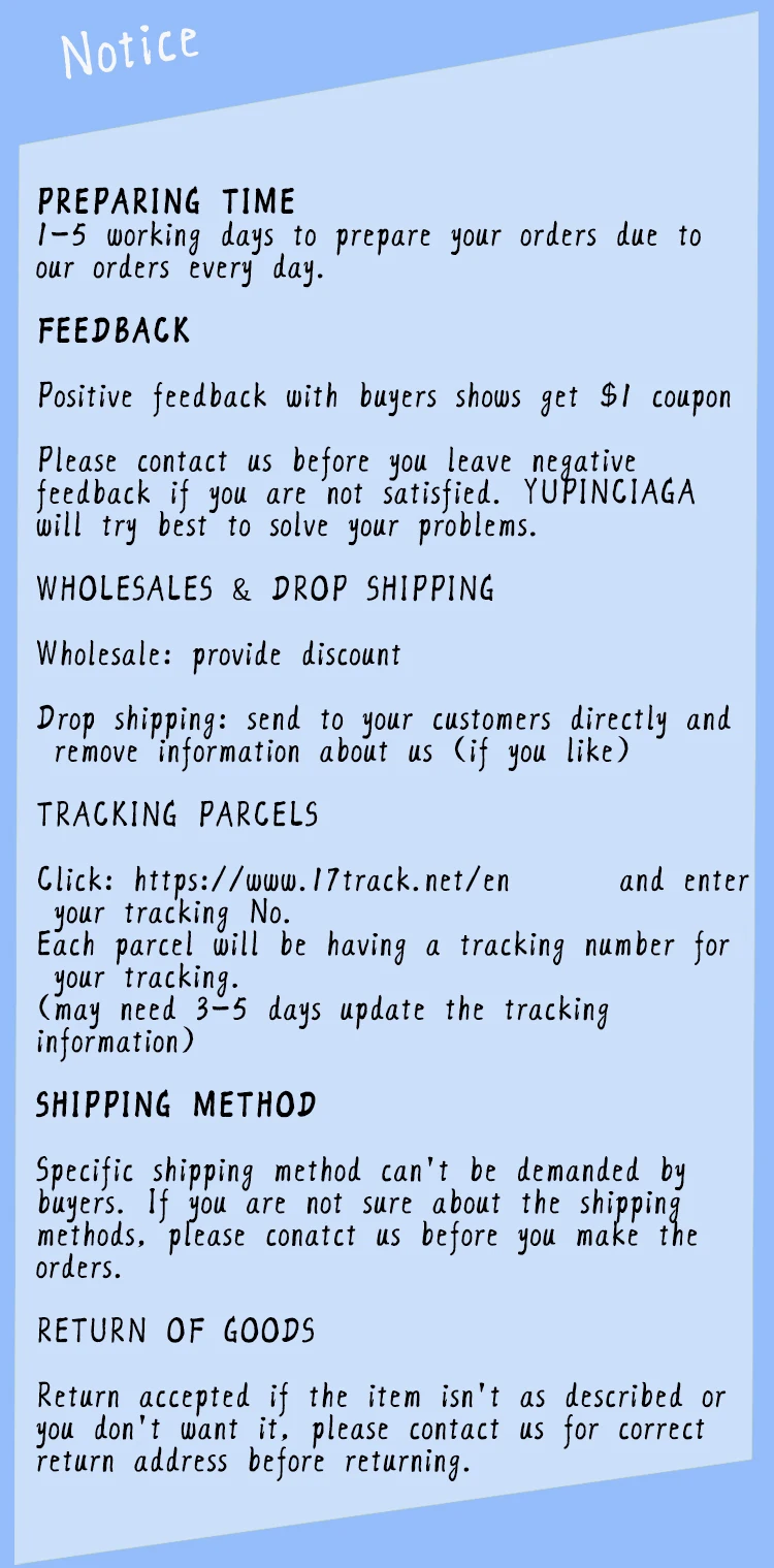 1. Если вы недовольны по какой-либо причине или у вас возникли проблемы с вашим заказом, пожалуйста, дайте нам знать, прежде чем оставлять отзывы. Мы с радостью вам вернуть или обменять товар. 2. Мы всегда отправляем посылка с безопасной упаковкой. Если вы видите что-то сломанное, когда получаете посылка, пожалуйста, сделайте фотографии прямо сейчас, вместо того, чтобы отказаться от нее! И мы можем начать возврат и обмен сразу! 3. Мы добрый и честный продавец. Мы надеемся, что каждый покупатель будет наслаждаться вашей покупкой здесь. Мы стремимся получить положительные отзывы по всем сделкам. Прежде чем открыть спор, пожалуйста, свяжитесь с нами. 4. Мы будем рады предложить Вам отличный сервис!