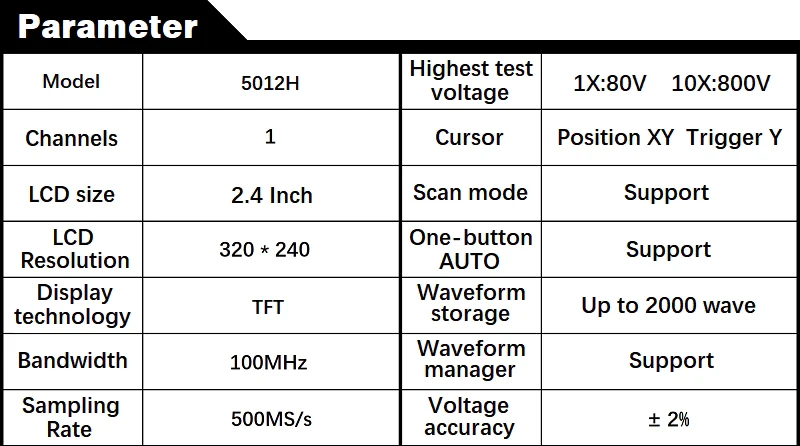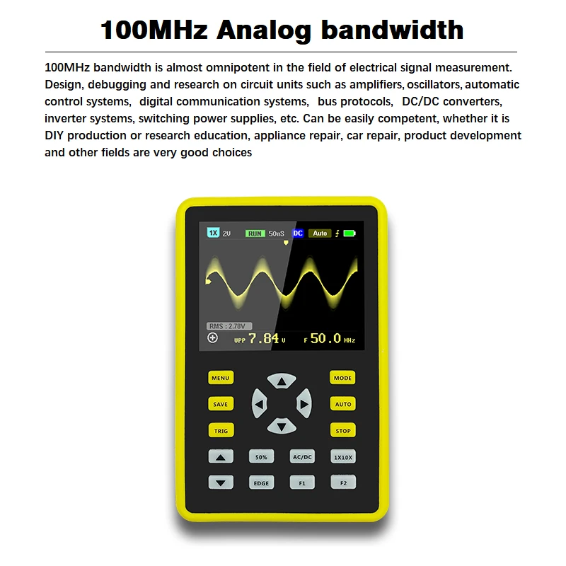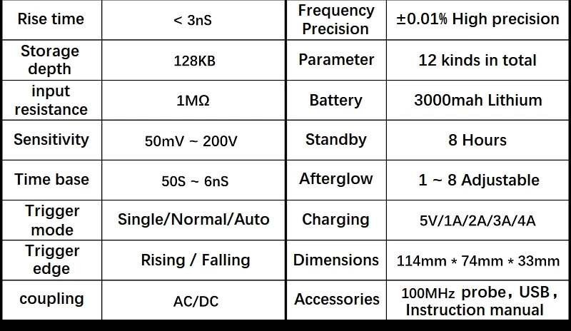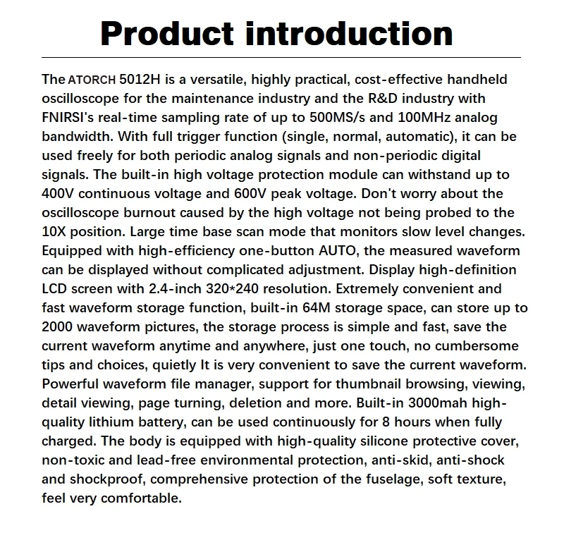 Описание: Универсальная, очень практичная модель, выполненная в стиле «ATORCH-5012H» экономичный Ручной осциллограф для обслуживающей отрасли и НИОКР с частотой дискретизации ATORCH в реальном времени до 500 мс/с и аналоговой полосой пропускания 100 МГц. С полной функцией триггера (однократное, нормальное, автоматическое), его можно использовать как для аналоговых, так и для нестандартных цифровых сигналов. Встроенный модуль защиты от высокого напряжения может выдерживать до 400 В Непрерывное напряжение и пиковое напряжение 600 В. Не беспокойтесь о том, что осциллограф выгорает, вызванный высоким напряжением, не проложен в положение 10X. Большой режим сканирования базы времени, который контролирует медленное изменение уровня. Измеренная Форма волны, оснащенная высокоэффективным автоматическим нажатием одной кнопки, может отображаться без сложного изменения. Дисплей высокой четкости ЖК-дисплей экран с 2,4 дюймов 320*240 разрешение. Чрезвычайно удобная и быстрая функция хранения сигналов, встроенная память на 64 м, может хранить до 2000 изображений, процесс хранения простой и быстрый, сохранять текущее состояние в любое время и в любом месте, просто одно касание, без громоздких подсказок и вариантов, бесшумно, очень удобно сохранять форму тока. Мощный файловый модуль waveform, поддержка просмотра миниатюрных фигур, просмотра, просмотра деталей, поворота страниц, удаления и многого другого. Встроенный высококачественный литиевый аккумулятор 3000 мА · ч, может использоваться без перерыва в течение 8 часов при полной зарядке. Корпус оснащен высокого качества силиконовый защитный чехол, не токсичен и не содержит свинец защиту окружающей среды, не скользящие; Анти-шок и ударопрочный, всесторонняя защита фюзеляжа, мягкая текстура, очень комфортно себя чувствую. Ключевые особенности: 1. Интеллектуальная защита от ожогов, 1 шт. выдерживает до 600 В, Выдерживает напряжение 2: технология Afterglow display 3:2.4 дюймовый цветной экран 4: аналоговая полоса пропускания 100 МГц @ 500 мс/с частота дискретизации (1X = 5 МГц, 10X = 100 МГц) 5: хранение формы волны одной кнопкой 6: Встроенный 64M объем запоминающего устройства, максимальный объем 2000 сигнала фотографии 7: Мощный Графический менеджера, поддержка просмотра миниатюрных фигур, просмотра, просмотра деталей, переворачивания, удаления и других функций 8: дальность измерения напряжения, 1 шт. можно измерить 0 ~ 80 в, 10x измерить 0 ~ 800 в 9: до 12 параметров измерения: VPP,VP,Vmax,Vmin,Vavg,Vrms, частые, Duty +,Duty-,Time +,Time-,Time 10: в любое время дисплей формы волны (Функция паузы) заморожен 11: оснащен высокоэффективным автоматическим нажатием одной кнопки 12: Полная функция запуска (одиночный, нормальный, автоматический) 13: Встроенная перезаряжаемая литиевая батарея 3000 мА · ч, полностью заряжается в течение 8 часов непрерывной работы 14: Регулировка яркости экрана 15: технология сжатия памяти, экран обновления формы волны не мерцает 16: противоскользящее покрытие защита от ударов при падении силиконовой втулкой 17: ультра небольшой объем, легко носить с собой Технические характеристики: 1: аналоговая ширина ремешка: 100 МГц 2: Максимальная частота дискретизации в реальном времени: 500 мс/с 3: вертикальная чувствительность: 50 мВ/див ~ 100 в/Див 4: Горизонтальный диапазон времени: 50S/div ~ 6NS/div 5: максимальное тестовое напряжение: 80 в (1X probe), 800 в (10X probe) 6. Глубина хранения: 128 Кб 7: Входное