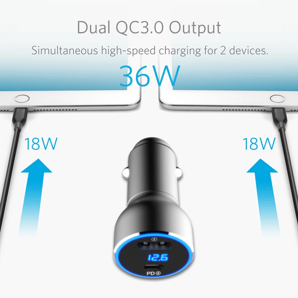 Светодиодный дисплей с 2 портами 36 Вт PD QC3.0 автомобильное зарядное устройство