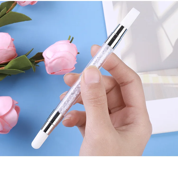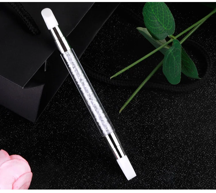 Акриловая ручка с Стразы внутри и металлический наконечник с силиконовой головкой.